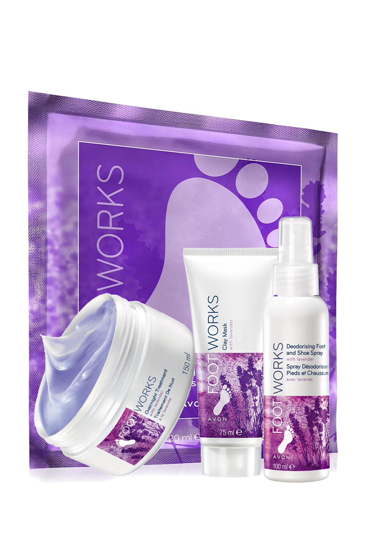 Package Content: - Foot Works Lavender Anti-Odor Foot Spray 100 Ml. - Foot Works Lavender Extract Night Foot Cream 150 Ml. - Foot Works Lavender Scented Moisturizing and Relaxing Foot Socks - Footworks Lavender Extract Foot Clay Mask 75 Ml.