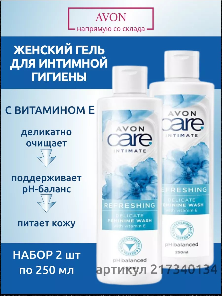 Set of 2: Care Intimate Gel with Vitamin E, 250 ml - a delicate gel for intimate hygiene from Avon. Gently cleanses the skin, providing a feeling of freshness that lasts all day. Contains lactic acid to maintain healthy microflora and protect against infections.