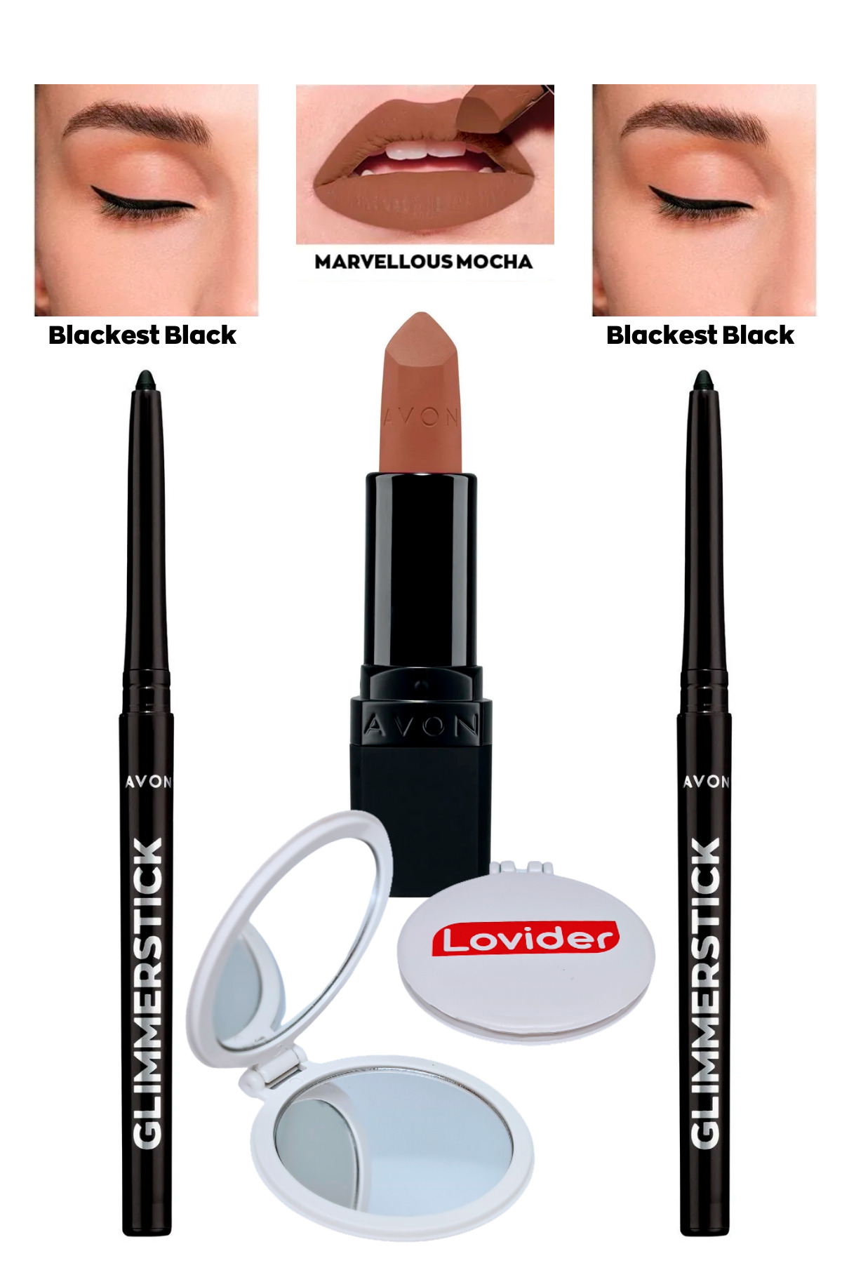 Avon Glimmerstick Lift Eyeliner Black 2 Pieces + Matte Lipstick Marvellous Mocha + Lovider Pocket Mirror