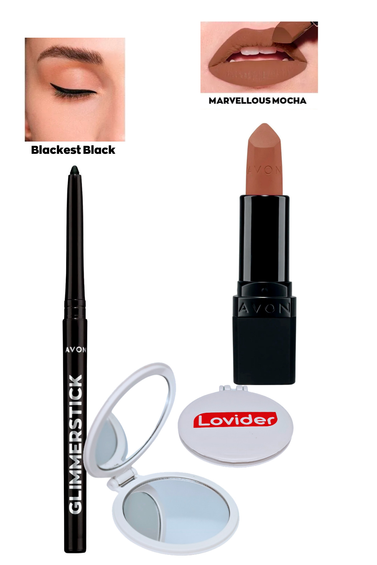 Avon Glimmerstick Lift Eyeliner Black + Matte Lipstick Marvellous Mocha + Lovider Pocket Mirror Gift