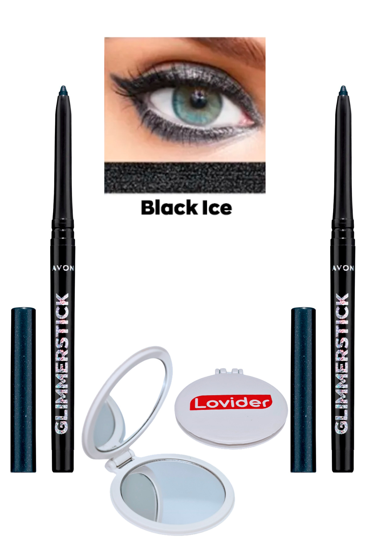 Avon Glimmerstick Lift Eyeliner Glitter - Black Ice 2 Pack + Lovider Pocket Mirror Gift
