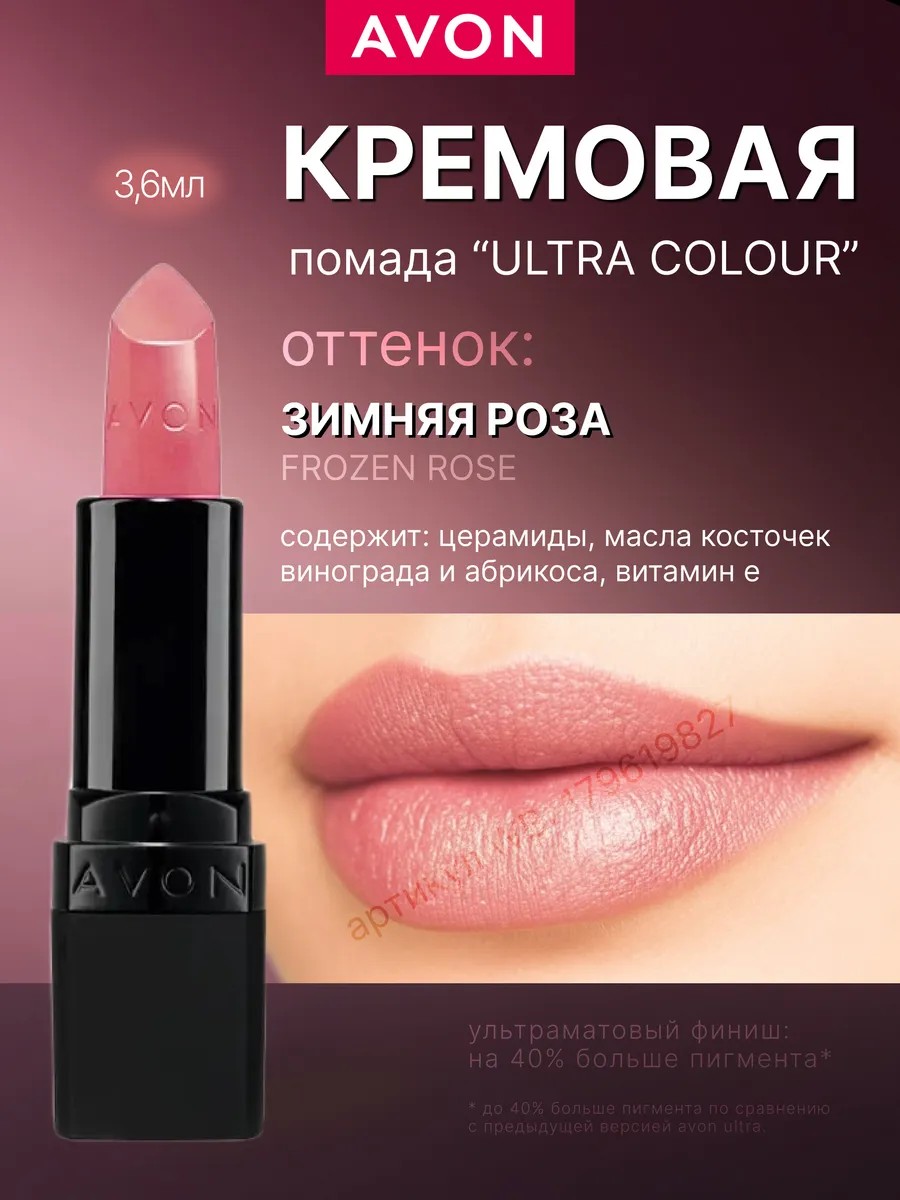 Ультра - это увлажняющая кремовая помада от Эйвон, за счет которой ваши губы будут максимально увлажнены и выглядеть красиво на протяжении всего дня. Она представлена в 30 восхитительных оттенках с различными финишами, что позволяет создать уникальные эффекты на губах. Воспользуйтесь этой уникальной возможностью и достигните безупречного макияжа губ с помадой AVON Ультра FROZEN ROZE зимняя роза!
