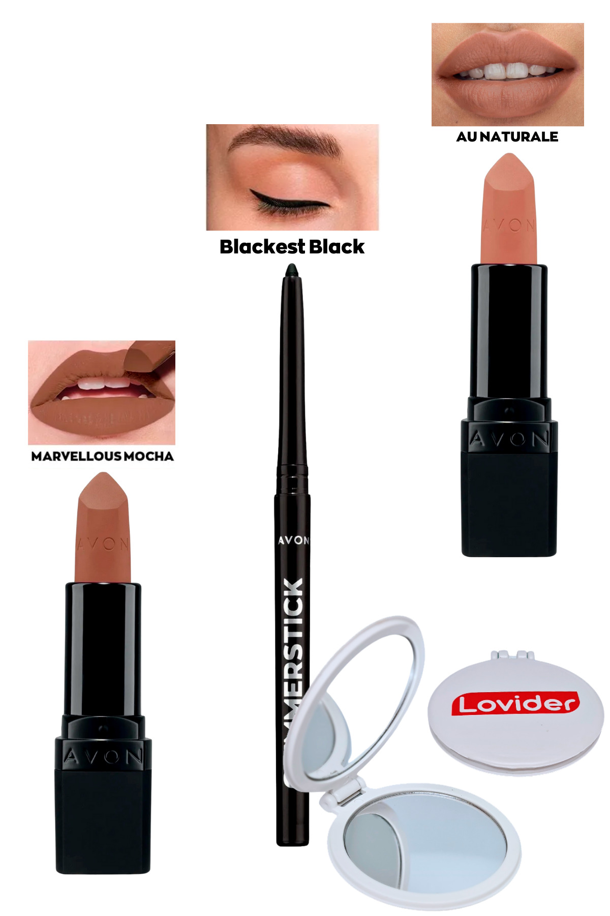 Avon Marvellous Mocha Matte Lipstick + Black Eyeliner + Au Naturale Matte Lipstick + Lovider Pocket Mirror