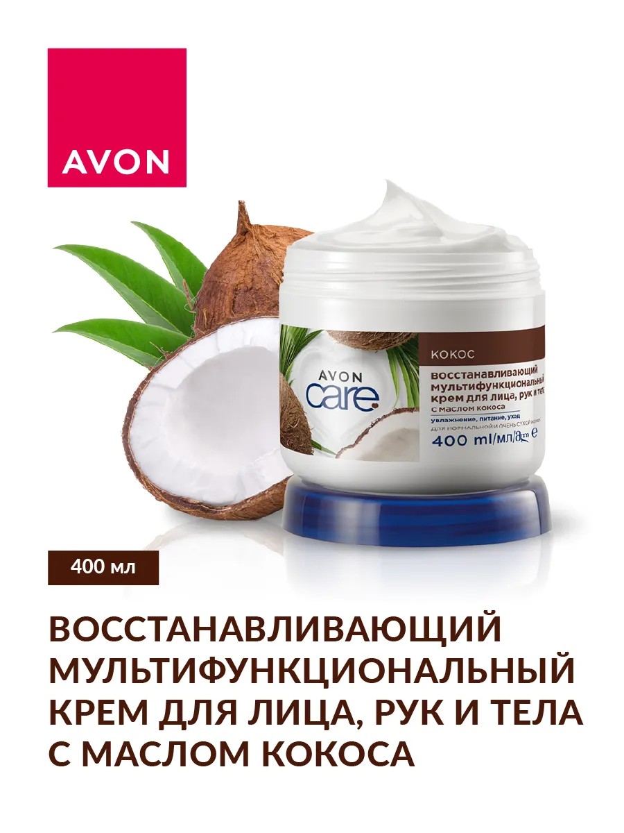 Avon Restorative Multifunctional Cream for Face, Hands, and Body with Coconut Oil, 400 ml. The cream effectively moisturizes and restores the skin, smoothing it and making it soft, thanks to the formula with coconut oil. The cream is quickly absorbed without leaving a sticky feeling. Coconut oil contains many saturated and unsaturated fatty acids, as well as vitamins C, E, and group B. It improves the condition of the skin, increases its elasticity, and stimulates regeneration processes. Suitable for normal to very dry skin. ACTION: • The formula with coconut oil provides hydration and intensively restores the skin • 3 in 1: hydration, nutrition, care