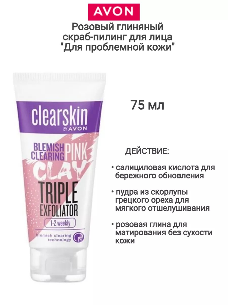 Серия Clearskin разработана экспертами Avon для молодых людей и подростков с проблемной кожей, которая склонна к частым высыпаниям. Скраб-пилинг для лица с активной формулой тройного действия обеспечит глубокое очищение и уход коже, склонной к высыпаниям.