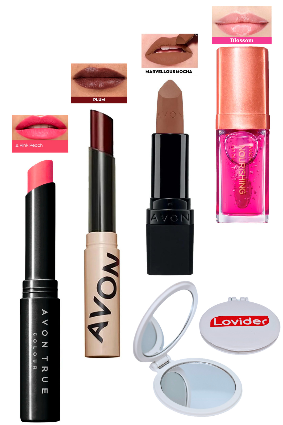 Avon Pink Peach Lipstick + Tinted Plum + Marvellous Mocha Matte Lipstick + Blossom Lip Oil + Lovider Pocket Mirror