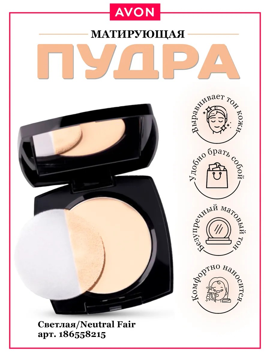 Эта матирующая компактная пудра для лица от avon - настоящий мастер своего дела. Она безупречно выравнивает тон кожи, как опытный художник гармонизирует цветовую палитру на своих полотнах. Благодаря компактному формату, эта пудра станет верным спутником в твоем ежедневном ритуале красоты и удобно поместится даже в самой маленькой сумочке.