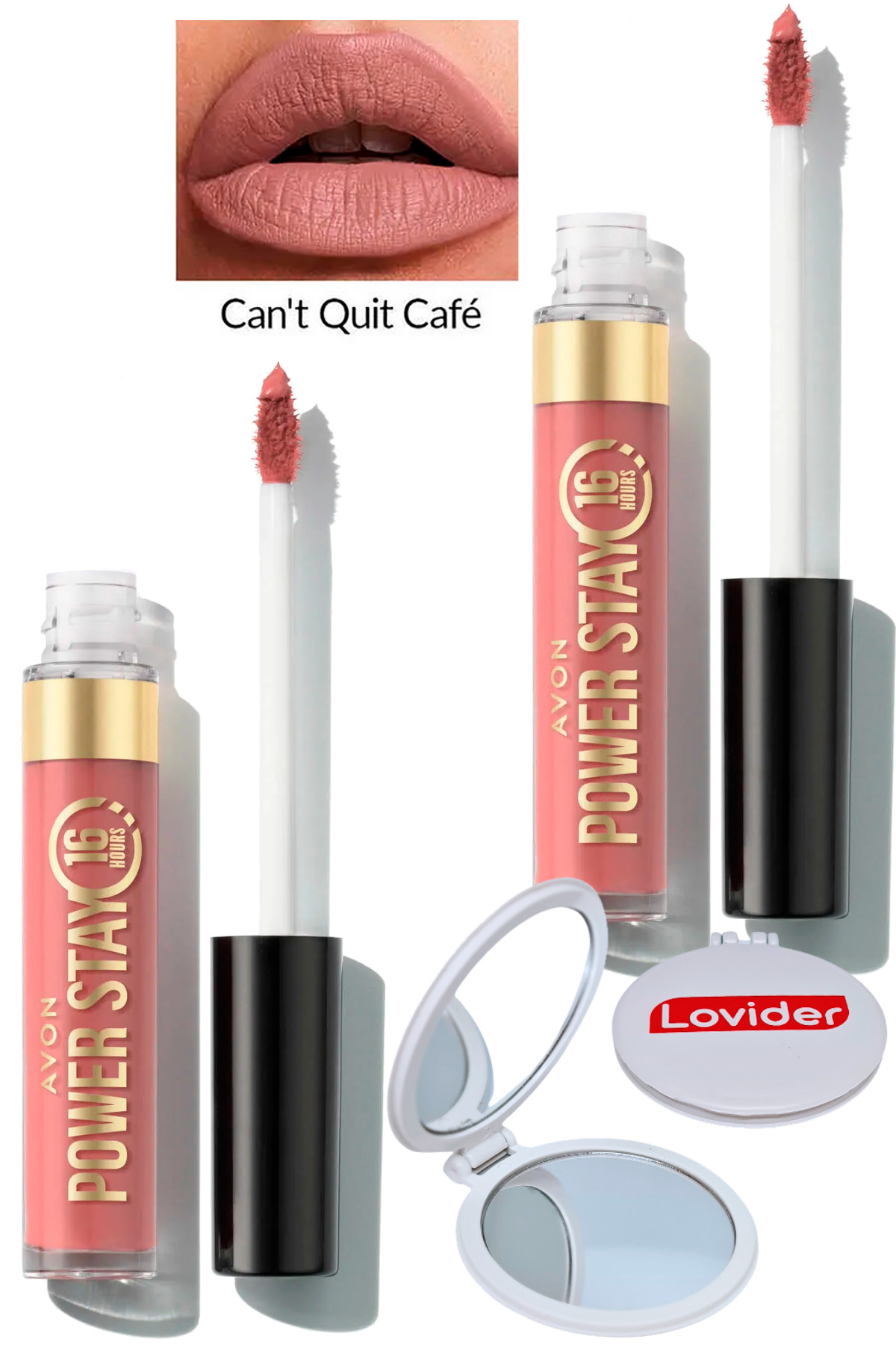 Avon Power Stay Liquid Matte Lipstick - Can't Quit Cafe 2 Pack + Lovider Pocket Mirror Gift
