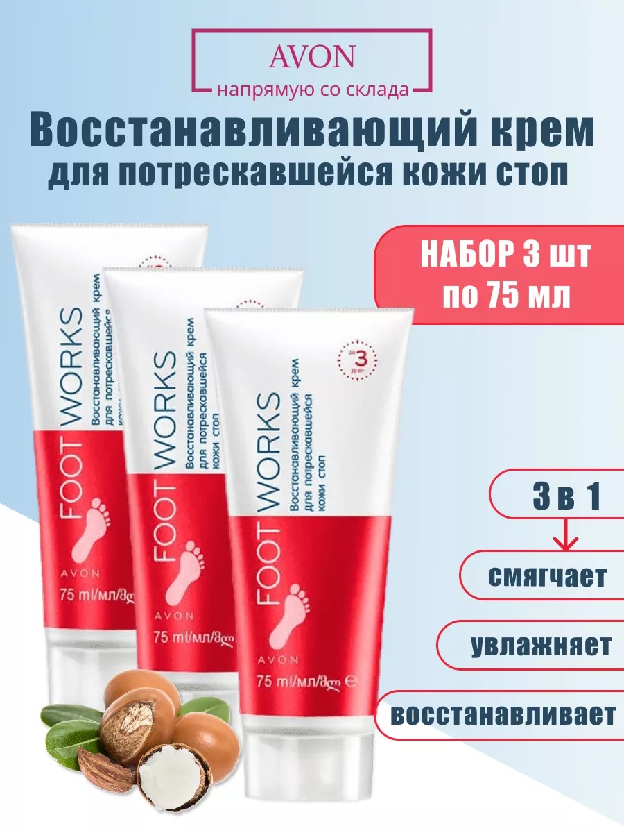 Восстанавливающий крем для потрескавшейся кожи стоп, 75 мл - набор 3 шт. Ухаживающий крем для ногFOOT WORKS от AVON, увлажняет и смягчает пятки, повышает эластичность кожи стоп. Крем для ног с мочевиной ускоряет заживление трещин на пятках, предотвращает образование натоптышей, удаляет утолщенный роговой слой кожи, стимулирует восстановление поврежденных тканей. Витамин Е и масло Ши мгновенно смягчают и питают сухую кожу ног, стимулируют регенерацию клеток на пяточках. Через 3 дня применения потрескавшаяся кожа стоп начинает восстанавливаться, возвращая коже ног здоровый вид. Крем для ногэйвон от трещинувлажняет даже самую сухую кожу, помогает избавиться от трещин на пяточках. Оздоровительная косметика для ухода за ногами для мужчин и женщин. Результат до и после ощутим уже через 3 дня использования. Уходовая косметика для ног эйвон, отличная идея для подарка: женщине, девушке, сестре, любимой, подруге, подарок себе, просто так. Сделайте приятный сюрприздля мамы, бабушки, коллеги, подруги - подарок на Новый год, День рождения, на День влюбленных, День Святого Валентина, 14 февраля, на 8 марта, День матери. В нашем магазине - Напрямую со склада Avon - Вас ждет большой ассортимент: оригинальной уходовой косметики для лица, рук и тела, декоративная косметика, брендовая парфюмерия, селективные ароматы. Наш магазин Косметики Avon также ищут запросам: AVON,Эйван, my avon, Эвон, Эван, Авон, крем для ног Эйван, крем от натоптышей, крем для стоп, средства для ухода за огрубевшей кожи ног.