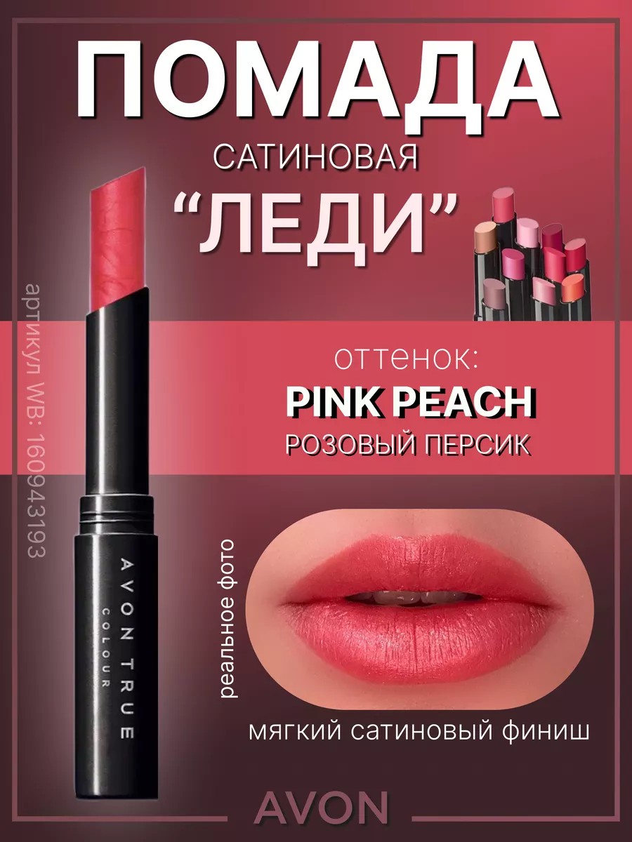 Сатиновая помада "Леди" цвет Розовый персик от Эйвон - это безупречное средство для создания яркого и стойкого макияжа губ. Ее формат в стике удобен в использовании, а сатиновый финиш придает губам элегантный и нежный вид.