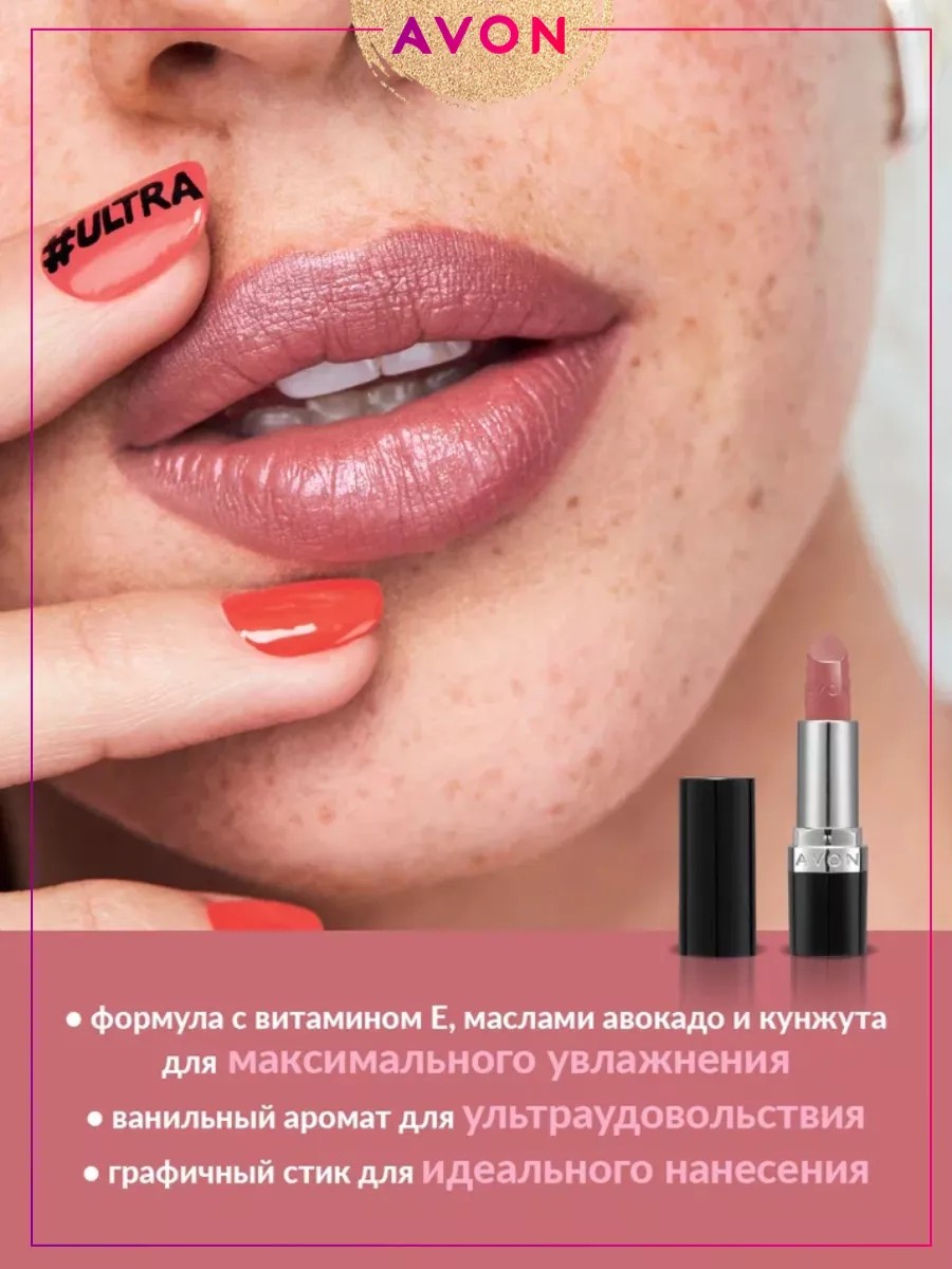 Avon Lipstick Creamy Lipstick for Makeup, Decorative Cosmetics for Women. The Ultra line of lipsticks offers a wide selection of shades, among which you're sure to find your perfect match. Subtle nude tones, from brown to copper, or perhaps bright pink or red? It all depends on your mood. Unlike liquid lipsticks, you don't need a brush to apply it, which is extremely convenient.