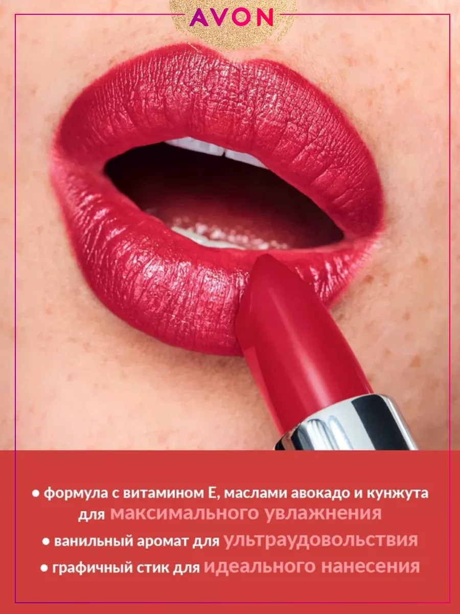 Губная помада Помада для губ Эйвон кремовая для макияжа декоративная косметика женская. Помада линейки Ультра - большой выбор оттенков, среди которых вы обязательно найдете свой. Сдержанные нюдовые тона, от коричневого до медного тона, а может быть, яркие розовые или красные? Все зависит от вашего настроения. В отличие от жидких помад, для ее нанесения не потребуется кисть, что крайне удобно. Помада в стике легко наносится, оставляя после себя мягкое глянцевое покрытие и насыщенный цвет. Она не сушит, не подчеркивает мелкие шелушения, отлично держится на губах, увлажняя и ухаживая за ними. Качественная альтернатива мегапопулярной помадам из раздела корейская косметика и белорусским производителям. Выберете свой оттенок или несколько - на каждый день и для особенного случая