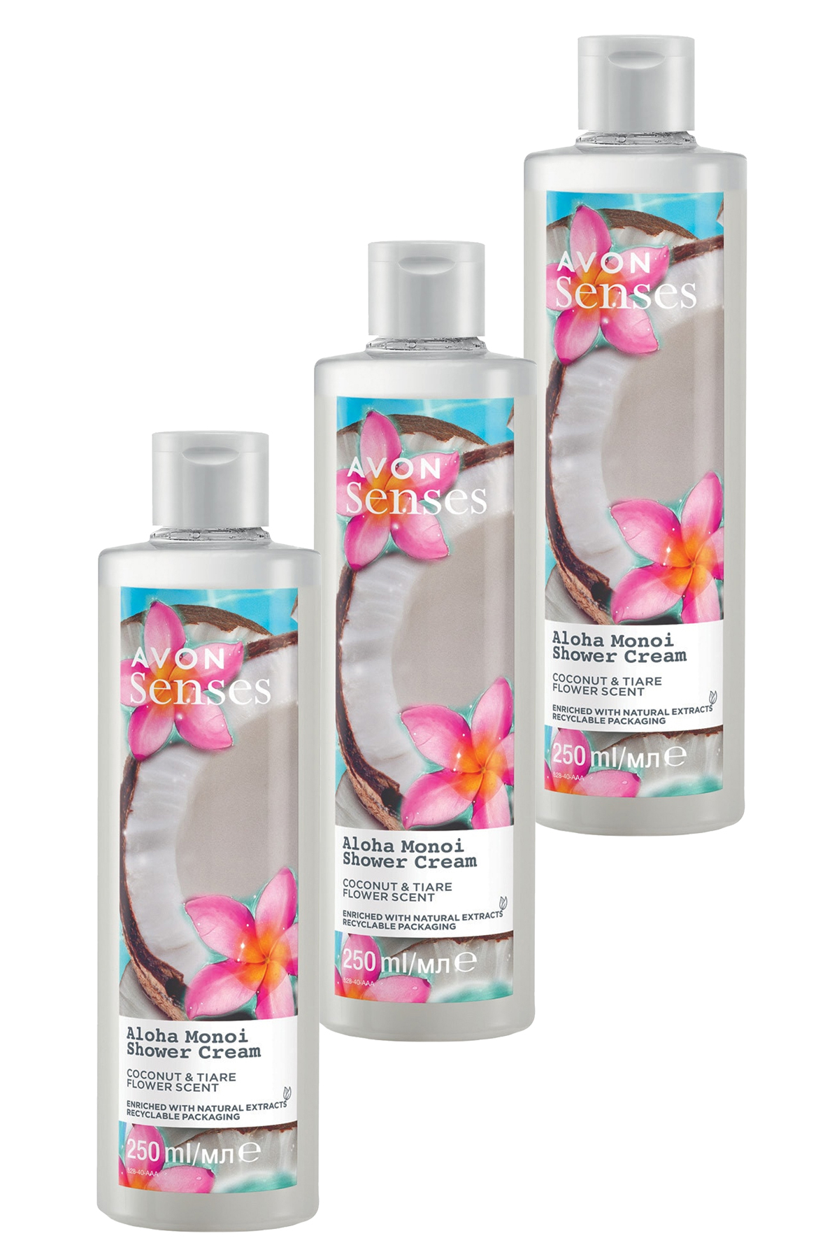 Avon Senses Aloha Monoi Tiare Flower and Coconut Scented Cream Shower Gel 250 Ml. Set of Three