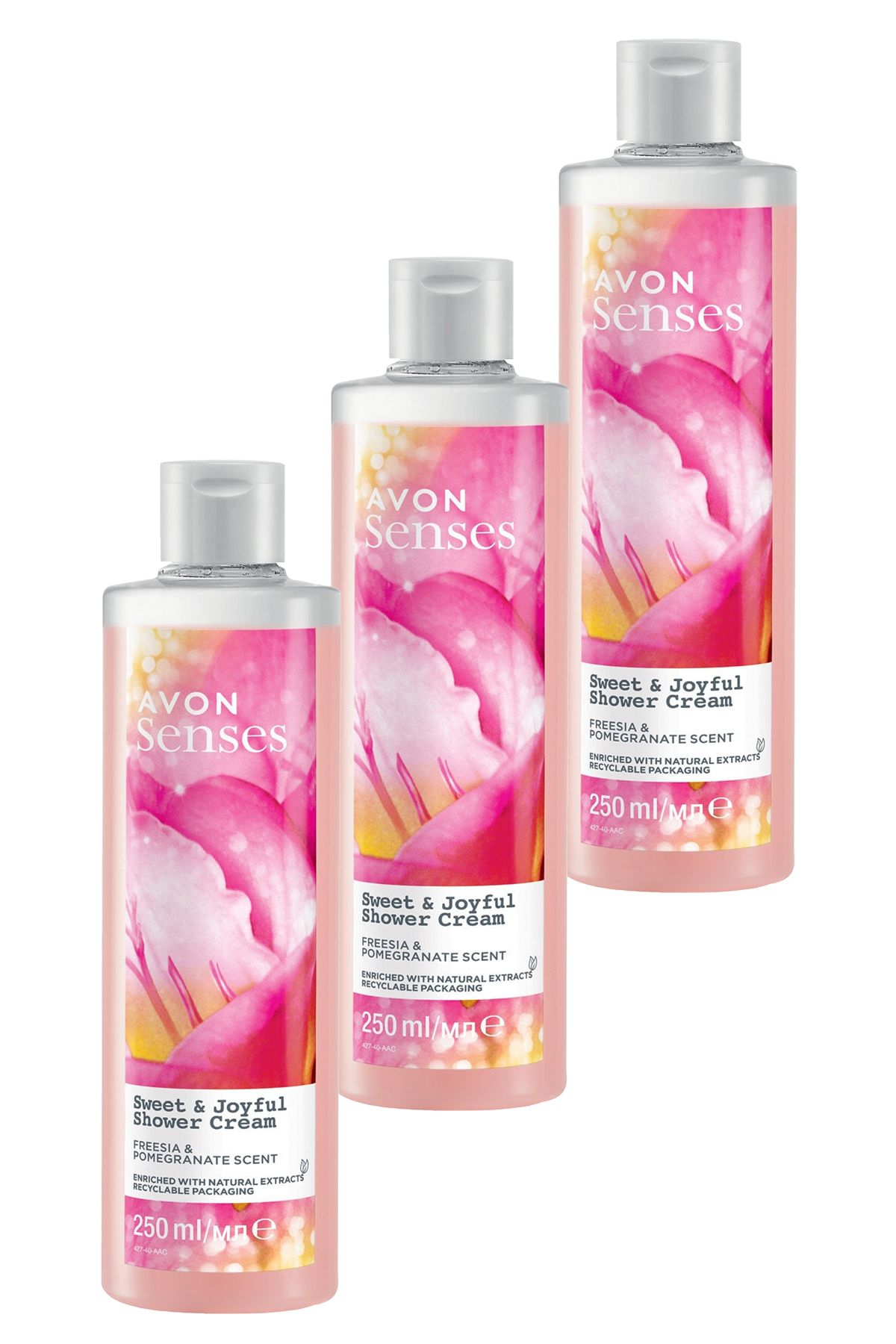 Avon Senses Sweat & Joyful Freesia and Pomegranate Scented Cream Shower Gel 250 Ml. Set of Three