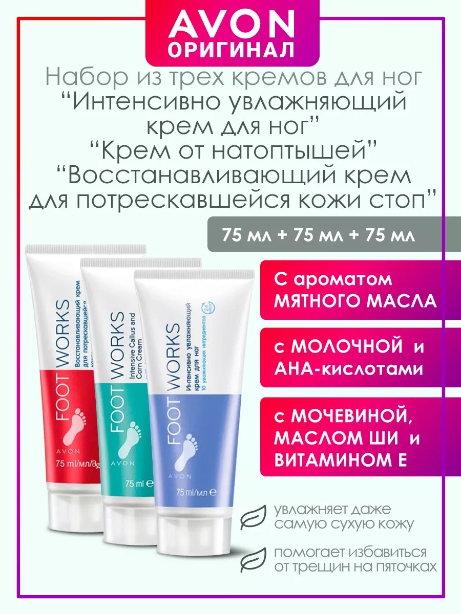 В набор для ног входит - интенсивно увлажняющий крем для ног 75мл, восстанавливающий крем для стоп 75мл, интенсивно увлажняющий крем от натоптышей 75мл.