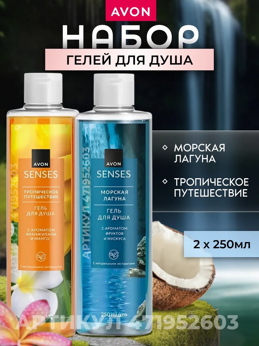 This 250 ml shower gel set (Tropical Journey and Sea Lagoon) is the perfect combination of deep cleansing and gentle care for your body. Are you ready to experience true bliss? Then take a look at our Avon Senses women's shower gel set! It features a unique formula that combines the superior properties of a gel and cream. This provides not only gentle cleansing but also intense hydration. Our hypoallergenic shower gel transforms ordinary washing into a true self-care ritual. One of the main advantages of shower gels with frangipani, mango, and fruit scents is their versatility. They are suitable for both women's skin, providing optimal care and deep cleansing, and for girls. Thanks to its perfumed aroma, our perfumed shower gel transforms ordinary washing into a true spa ritual, filling the bathroom with pleasant notes. Pay special attention to the moisturizing properties of this shower gel. It intensely moisturizes even dry skin, leaving it soft, supple, and silky to the touch. This shower gel is the perfect combination of hydration, cleansing, and body care. Its unique formula, enriched with natural extracts, leaves your skin soft, hydrated, and supple. Our shower gel is more than just a hygiene product; it's a true self-care ritual that will leave you feeling fresh and comfortable every day. If you still haven't found the perfect gift for a loved one, this set of fragrant creamy gels is the perfect choice! So why settle for a regular shower when you can indulge in pure bliss with our set of delicious women's shower gels? Try them today and feel the euphoria they will bring to your life! At our official Avon store, you'll find women's cosmetics, shower products for women, gift sets, and various Avon products.