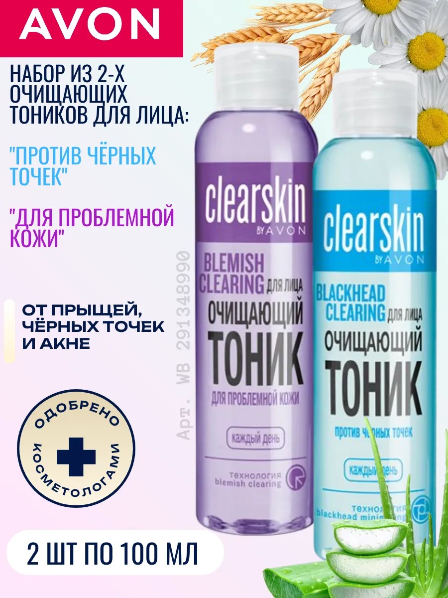 Набор из 2-х очищающих тоников для лица Clearskin: 1. «Для проблемной кожи» с экстрактом пшеницы и алоэ вера 100 мл; 2. «Против черных точек» с алоэ и экстрактом ромашки 100 мл. Серия Clearskin разработана экспертами Avon для молодых людей и подростков с проблемной кожей, которая склонна к частым высыпаниям. Формула с экстрактом пшеницы и алоэ вера контролирует жировые выделения кожи и удаляет их излишки. После применения кожа остается чистой и свежей. Подходит для проблемной кожи. Действие: очищает кожу от загрязнений и остатков макияжа контролирует выработку кожного жира, не пересушивая кожу снимает раздражение кожи. Очищающий тоник с алоэ вера и экстрактом ромашки помогает удалить излишки кожного жира, последние следы загрязнений и стойкого макияжа. Благодаря содержанию салициловой кислоты средство предотвращает образование черных точек. После применения кожа лица становится чистой и свежей. Подходит для жирной и склонной к акне коже. Действие: • очищает и освежает кожу • борется с появлением черных точек • уменьшает жирный блеск.