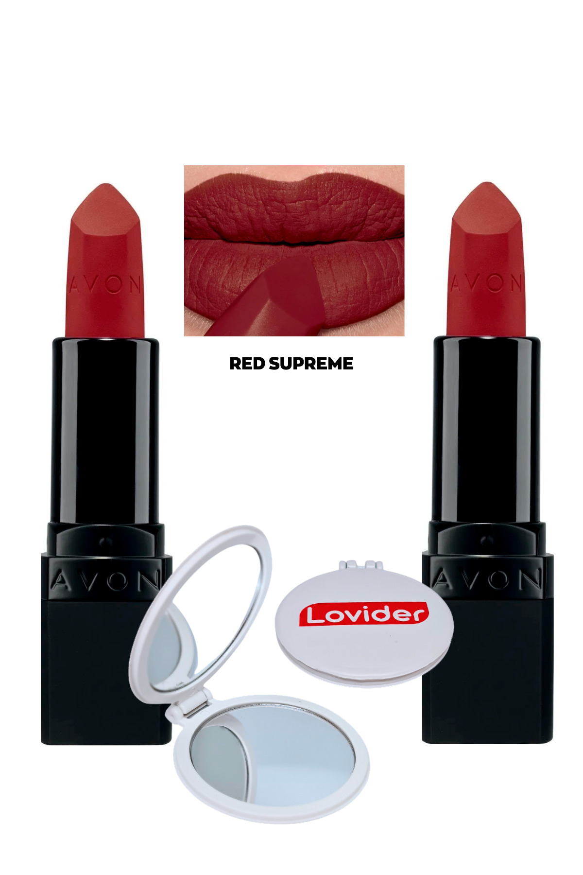 Avon Ultra Matte Lipstick Red Supreme 2 Pack + Lovider Pocket Mirror Gift