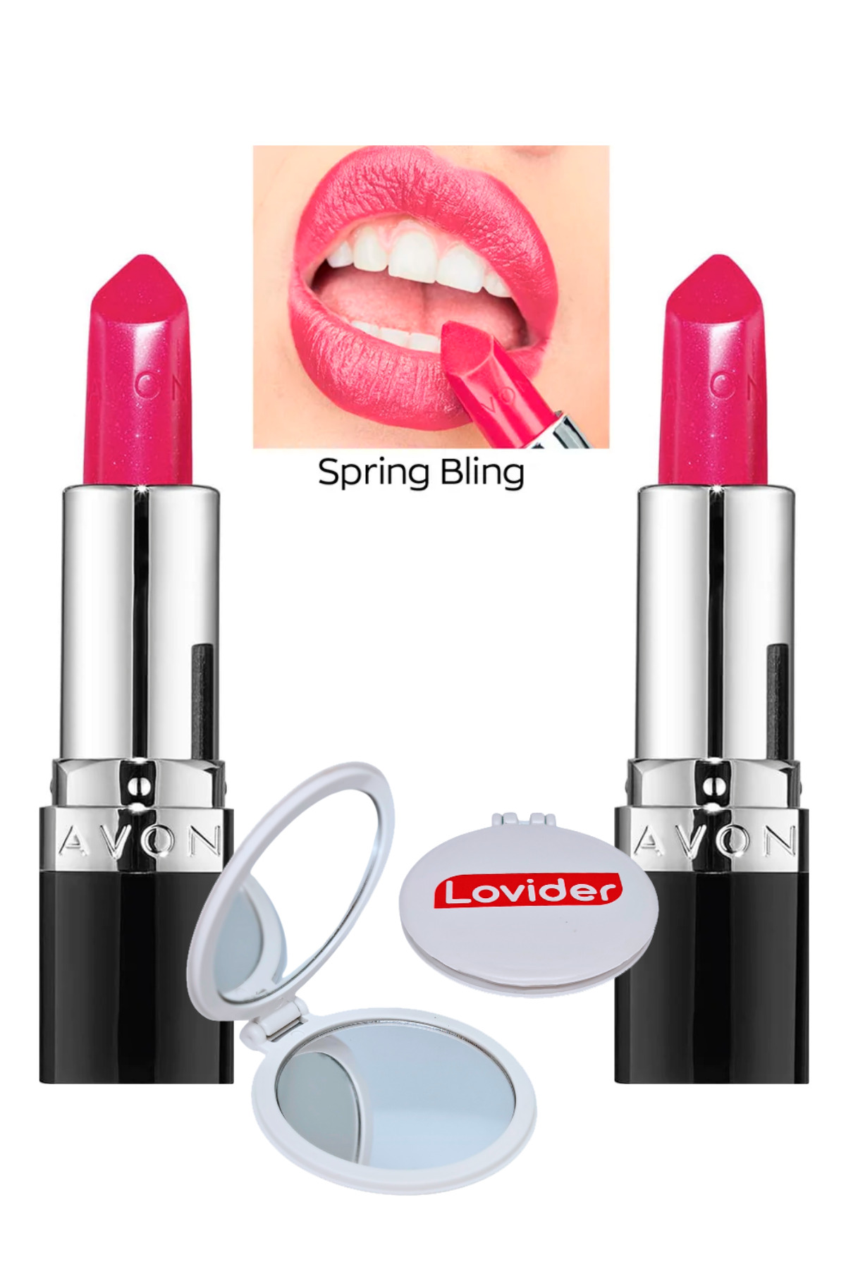 Avon Ultra Shimmer Glitter Lipstick Spring Bling 2 Pack + Lovider Pocket Mirror Gift