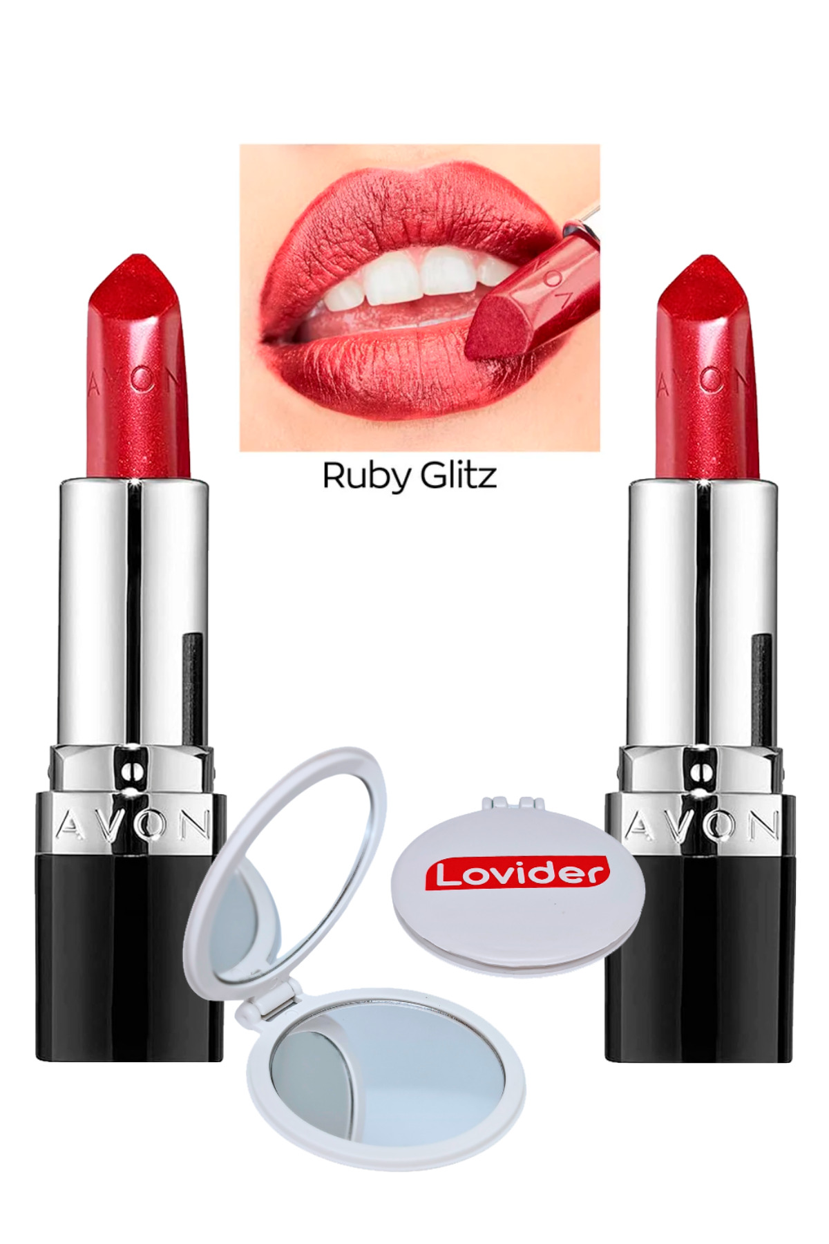 Avon Ultra Shimmer Lipstick Ruby Glitz 2 Pack + Lovider Pocket Mirror