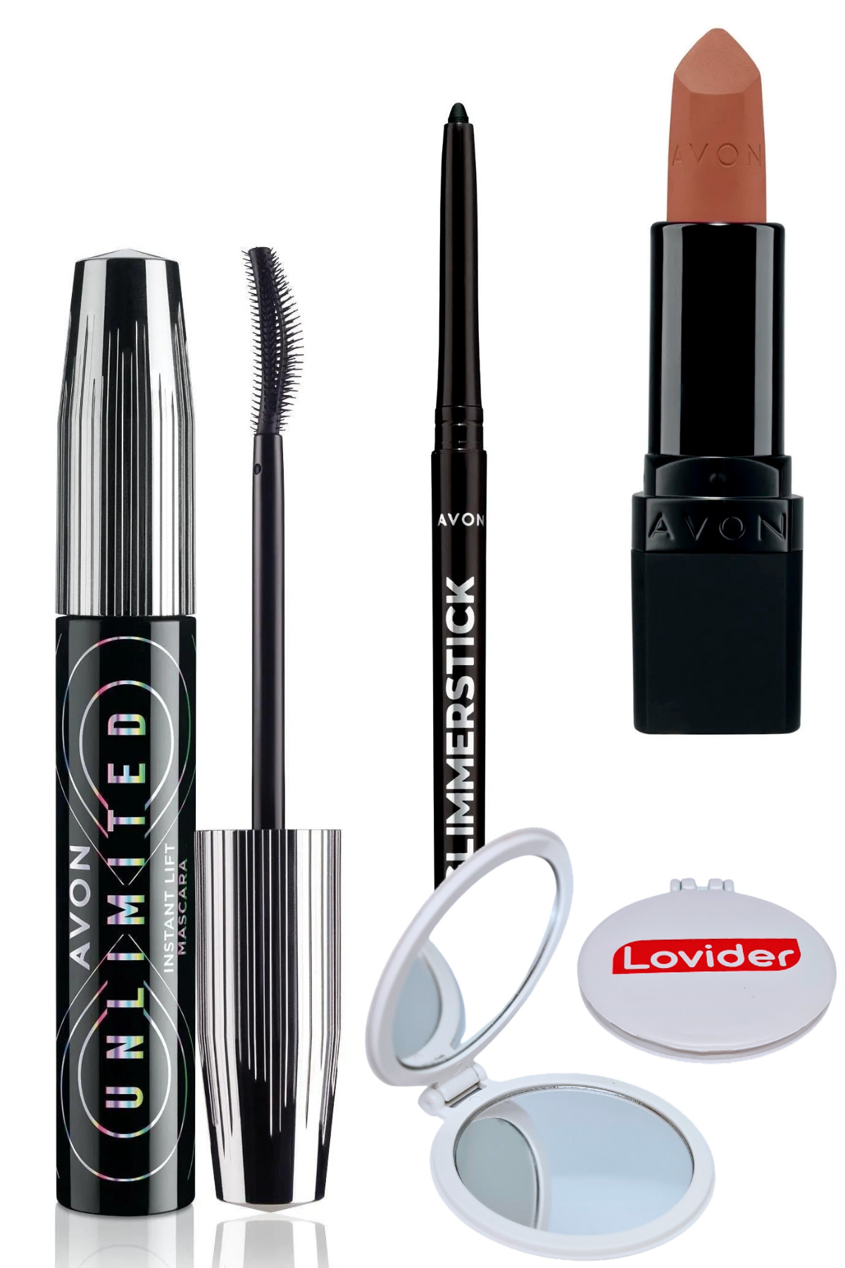 Avon Unlimited Mascara Black + Black Eyeliner + Marvellous Mocha Lipstick + Lovider Pocket Mirror