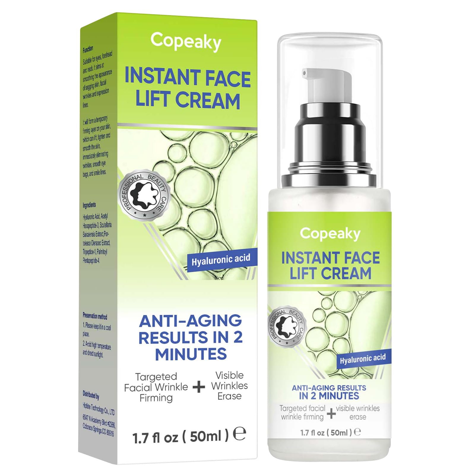 Tired of skin that looks tired? If wrinkles, loss of firmness, and dullness are making you look older than you feel, it's time for a skincare breakthrough. Skip the waiting and the worries. Our Instant Face Lift Cream is your 50ml secret to a visibly lifted, tightened, and radiant complexion. This advanced cream combines a lightweight, non-greasy formula with powerful actives to provide intense hydration and an instant tightening effect for both your face and neck. Reclaim a more youthful, sculpted look on your own terms. Why This Instant Face Lift Cream Works for You: Immediate Tightening Lifting Effect: Feel a noticeable firming sensation as soon as you apply it. This instant face lift cream works to visibly reduce the appearance of sagging, especially around the jawline, cheeks, and neck, for an instantly more defined contour. Lightweight, Fast-Absorbing Non-Greasy: Experience luxury without the residue. Our non-greasy formula absorbs quickly, making it perfect for daily use under makeup or alone. It's gentle and comfortable, designed not to clog pores or feel heavy on your skin. Suitable for All Skin Types, Day or Night: A versatile anti-aging solution. Its gentle yet effective formula makes it ideal for daily use, providing a quick confidence boost before events or as part of your regular skincare routine. How to Use for Best Results: Start with clean, dry skin on your face and neck. Take a small amount (about the size of a pea) of the instant face lift cream. Gently massage it onto your skin using upward and outward motions until fully absorbed. Use daily, morning and or night. For an extra lift before a special occasion, apply and allow it to fully set before proceeding with your makeup. Consistency is key to maintaining the lifted, smooth appearance of your skin.Quick Easy Daily Routine Upgrade Achieve professional-looking results in seconds. Simply apply a pearl-sized amount to cleansed face and neck, gently massaging upward. It's your perfect 50ml companion for a quick confidence boost before any event. Smooths Skin Texture Improves Radiance Beyond lifting, this multitasking cream helps to refine your skin's surface. It works to smooth the look of wrinkles and uneven texture, promoting a smoother, more even-toned, and naturally radiant glow. Lightweight, Gentle Non-Greasy Formula Enjoy a premium skincare experience without the heaviness. Our fast-absorbing, non-greasy formula is gentle on all skin types, providing effective care. Provides Intense, Lasting Hydration Powered by moisture-binding ingredients, this cream delivers intense hydration deep into the skin's layers. It helps to plump fine lines, soothe dryness, and leave your complexion feeling supple and refreshed all day. Experience an Instant Face Lift Feel a visible tightening sensation from the first use. This instant face lift cream works to immediately firm the appearance of skin on your face and neck, reducing the look of sagging for a more sculpted contour.