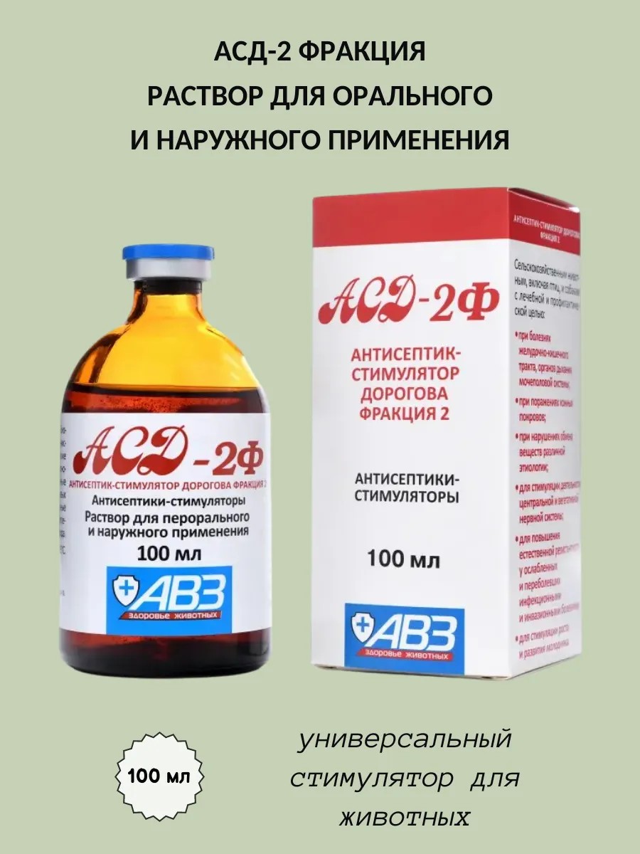 АСД-2Ф – это уникальный препарат с широким спектром действия, применяемый для лечения и профилактики различных заболеваний у собак, кошек, птиц и сельскохозяйственных животных.