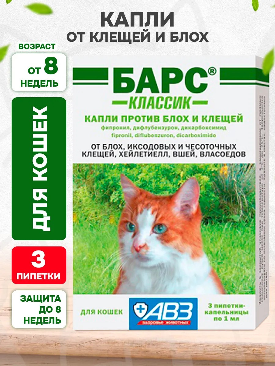 АВЗ Барс Классик капли от клещей и блох для кошек 3 пипетки