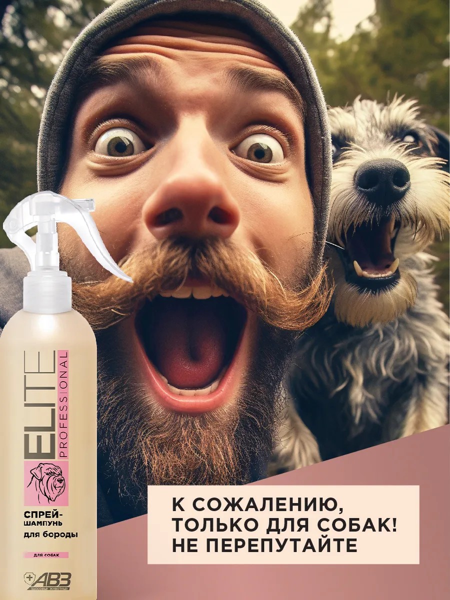 A spray shampoo for dogs with beards, which require special care. Owners of bearded dog breeds such as Airedale Terriers, Yorkies, Brussels Griffons, Wirehaired Dachshunds, and many terrier breeds often ask after feeding their pet: is it enough to simply wipe their dog's beard with a napkin? No. Microorganisms can remain in the dog's beard, which can cause problems later. Bearded dogs and puppies require special care, as carelessly groomed beards can lead to fungus, acne, and other conditions, the treatment of which can be costly. For owners of these bearded dog breeds, we have developed Elite Professional antifungal spray shampoo for dogs and puppies with beards. This specially formulated antifungal product is designed for daily treatment of dogs' coats after feeding. This spray shampoo contains natural extracts of celandine, henna, St. John's wort, antifungal agents, and allantoin. The combination of a gentle cleansing complex, natural herbal extracts, and allantoin effectively cleanses coats without overdrying. Ideal for daily use after feeding, this shampoo easily removes oil and food debris from dogs' beards and skin. Frequent use prevents fungal infections, softens the epidermis, relieves itching, restores and strengthens the coat, and promotes easy combing. Due to the absence of unnecessary fragrances, this dog shampoo for small and large breeds will not irritate your pet or provoke allergies. Suitable for white dogs and puppies, this pet shampoo rinses easily, ensuring quick and easy cleansing. ELITE series shampoos are recommended for use undiluted on areas requiring intensive cleansing. in a ratio of 1:5 – for regular washing; in a ratio of 1:10 – for light or daily washing.