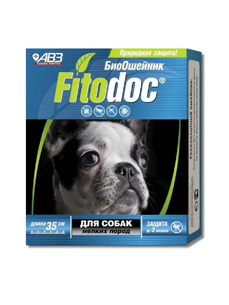 АВЗ, Ошейник репеллентный Фитодок для собак, 35 см. Репеллентное средство для защиты собак и кошек от эктопаразитов. Преимущества: содержит только натуральные природные действующие вещества. Надежно защищает от большого спектра насекомых и клещей, паразитирующих на собаках и кошках. Выбор размеров для собак и кошек разных пород. Показания к применению. Ошейник репеллентный Фитодок применяют собакам и кошкам для защиты от блох, вшей, власоедов, комаров, иксодовых и чесоточных клещей. Ошейник надевают на животное, оставляя между шеей и ошейником зазор в 1,0 см, затем свободный конец ленты пропускают через фиксатор и излишек срезают, оставляя конец в 1,5–2 см. Постоянное ношение репеллентного ошейника «Фитодок» обеспечивает защиту собак и кошек от насекомых до 3-х месяцев, от иксодовых клещей до 5 недель. В первые дни применения ошейника возможно нападение и прикрепление иксодовых клещей, однако через 1–2 дня паразиты покидают животное. При сильной степени поражения животного насекомыми перед применением ошейника животное рекомендуется вымыть инсектицидным зоошампунем.