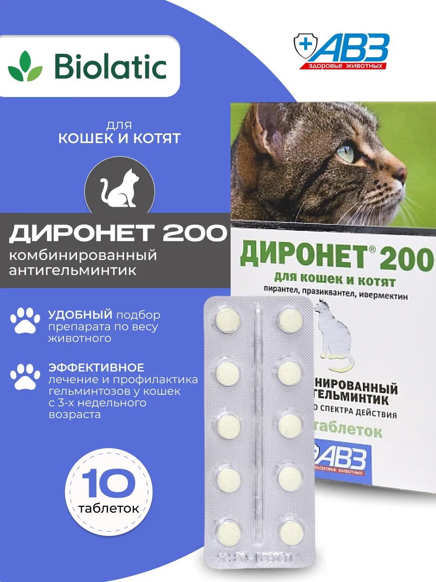 АВЗ Диронет 200 антигельминтный препарат для кошек и котят, 10 таб.