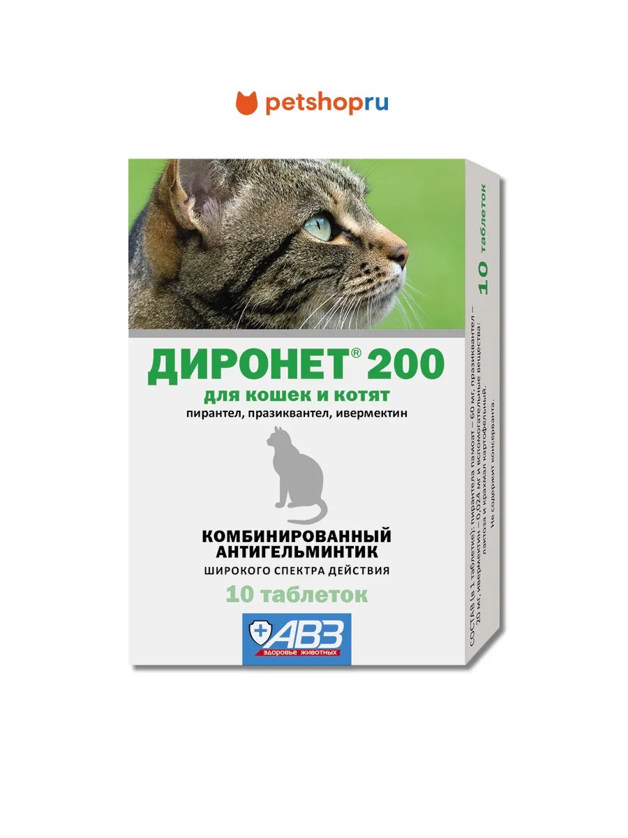 ДИРОНЕТ 200 предназначен для кошек, содержит в одной таблетке пирантела памоата 60 мг, празиквантела 20 мг и ивермектина 0,024 мг.