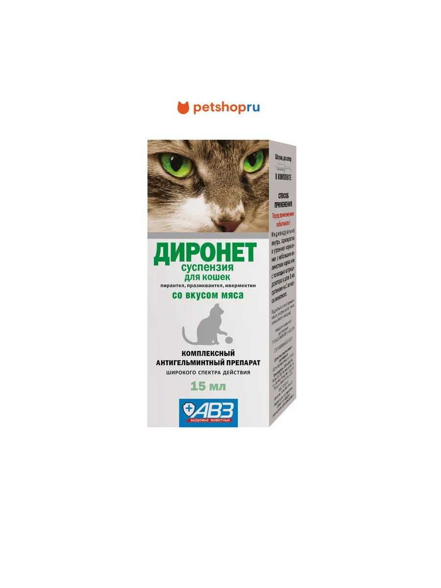 ДИРОНЕТ суспензию применяют кошкам для лечения и профилактики нематодозов желудочно-кишечного тракта (токсокароз, токсаскариоз, унцинариоз, анкилостомоз, трихоцефалез) и цестодозов (тениоз, дипилидиоз, эхинококкоз, дифиллоботриоз, мезоцестоидоз), а также для профилактики дирофиляриоза.