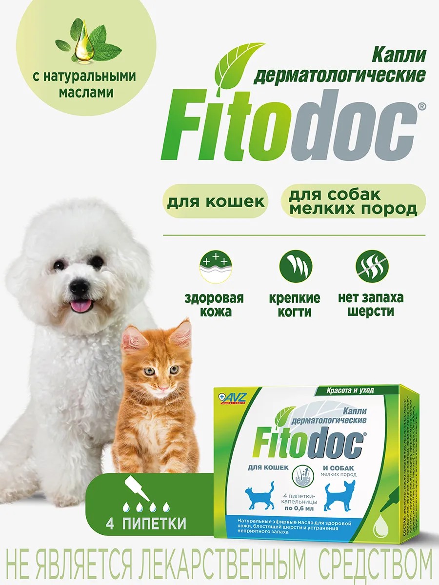 Полное наименование товараFITODOC капли дерматологические для мелких пород собак и кошек - средство для комплексного ухода за состоянием кожно-волосяного покрова собак и кошек и устранения неприятного запаха