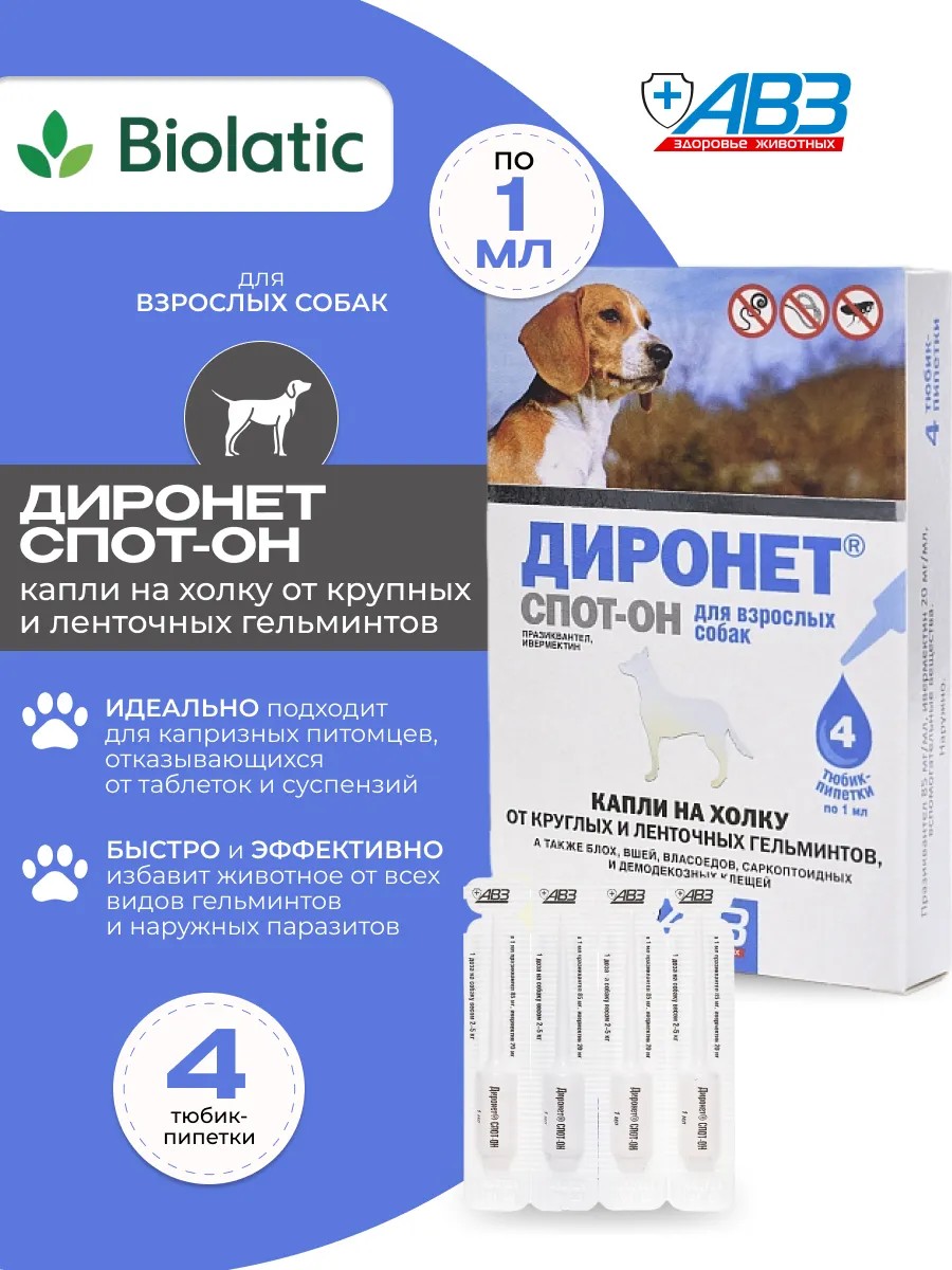 АВЗ Диронет Спот-Он капли на холку для взрослых собак, 1 мл 4пип