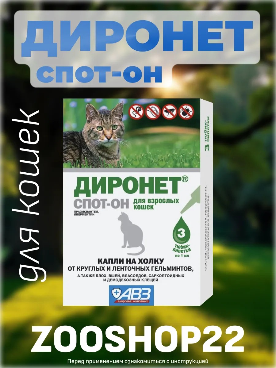 | Full name of the product | Dironet spot-on drops on the withers for cats and kittens from worms and helminths: against round and tapeworms, for deworming, for helminthiasis, 3 ml, pipette |