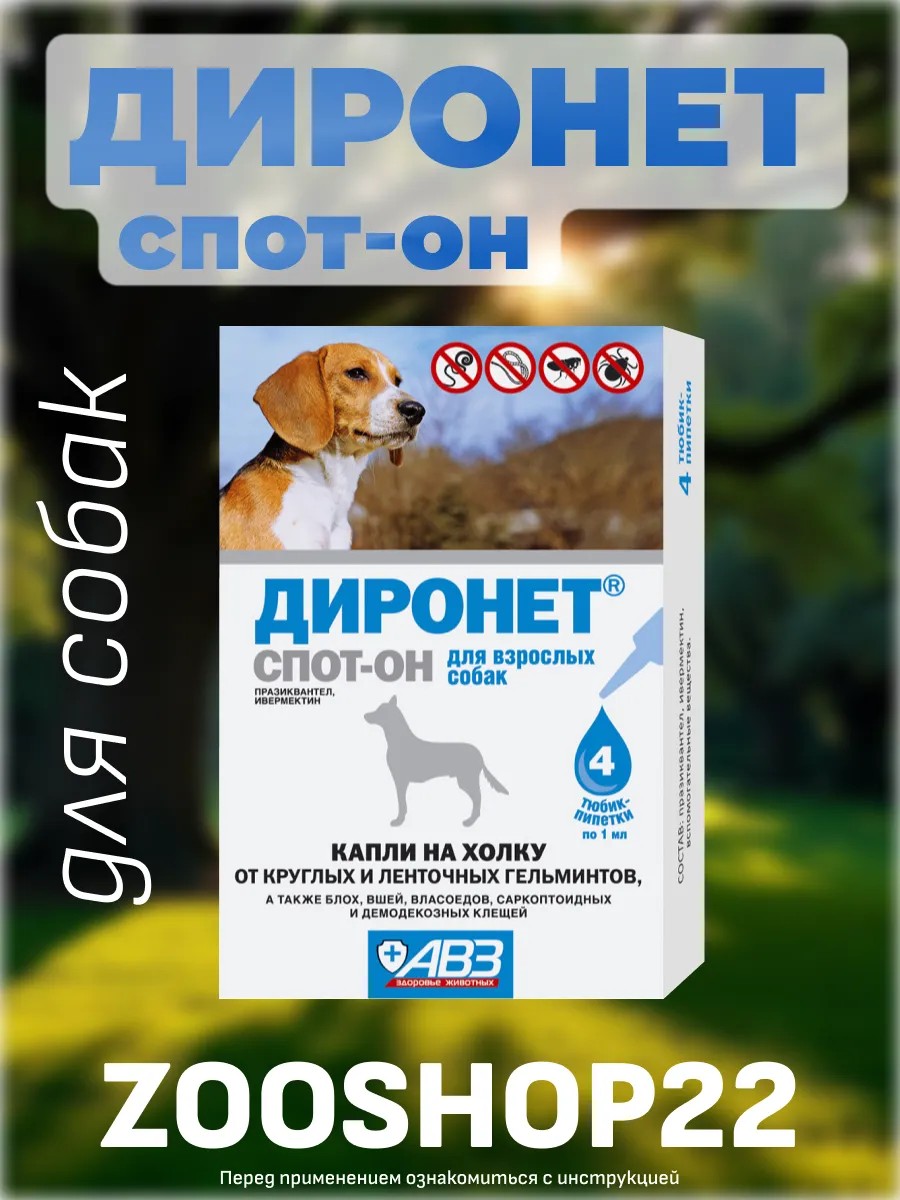 | Full name of the product | Dironet spot-on drops on the withers for dogs and puppies from worms and helminths: against round and tapeworms, for deworming, for helminthiasis, 4 ml, pipette |