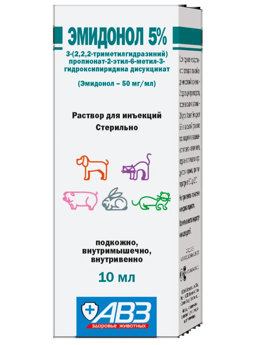 Emidonol 5% - injection solution is prescribed to dogs, cats, rabbits, fur animals and decorative rodents for the purpose of treatment and prevention as part of complex therapy for pathological conditions accompanied by hypoxia (oxygen deficiency) of organs and tissues.