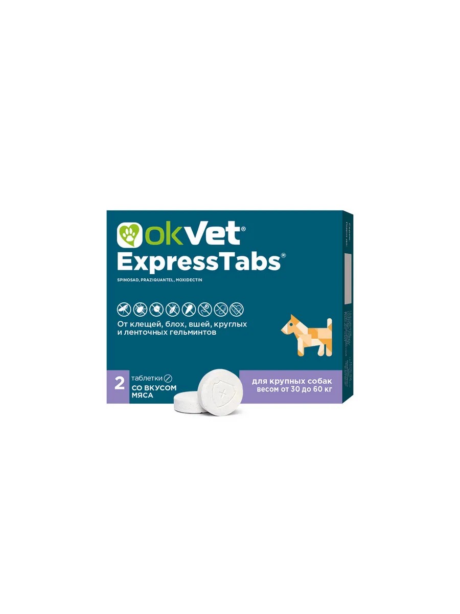 An antiparasitic drug for dogs with combined action for the treatment and prevention of parasitic diseases caused by fleas, ticks, lice and helminths. Advantages: protects within 30 minutes after application against 37 types of external and internal parasites; protection against fleas for up to 56 days, against ticks for up to 42 days; protection does not wash off during bathing, shampooing and in the rain; you can pet and cuddle your pet; meat-flavored tablets are popular with dogs; treating a dog for parasites is as easy as giving it a treat; Ingredients and properties: 1 ExpressTabs tablet for dogs weighing from 30 to 60 kg contains spinosad - 900 mg, praziquantel - 150 mg and moxidectin - 6 mg. As excipients, the drug contains: lactose, flavor additive - "meat flavor", pregelatinized corn starch and calcium stearate. The active ingredients included in the preparation provide a wide spectrum of its antiparasitic action against: fleas (Ctenocephalides canis, Ctenocephalides felis), ixodid ticks (Ixodes ricinus, Ixodes persulcatus, Ixodes scapularis, Rhipicephalus sanguineus, Dermacentor reticulatus, Dermacentor silvarum, Dermacentor marginatus, Dermacentor variabilis, Amblyomma americanum, Haemaphysalis flava, Haemaphysalis campanulata), lice (Linognathus setosus, Trichodectes canis, Felicola subrostratus), scabies mites (Sarcoptes canis, Notoedres cati, Otodectos cynotis), trombidiform mites (Demodex canis, Cheyletiella yasguri), roundworms - nematodes (Ancylostoma caninum, Toxocara canis, T. cati (T. mystax), Toxascaris leonina, Trichuris vulpis, Uncinaria stenocephala, Thelazia callipaeda, Angiostrongylus vasorum, Aelurostrongylus abstrusus, Crenosoma vulpis, Dirofilaria immitis (microfilariae), Dirofilaria repens (microfilariae)) and tapeworms - cestodes (Dipylidium caninum, Multiceps multiceps, Taenia hydatigena, Taenia ovis, Taenia pisiformis, Taenia taeniaeformis, Echinococcus granulosus, Alveococcus multilocularis) parasitizing dogs. The antiparasitic effect of the drug begins 30 minutes after administration and ensures the death of parasites within 24-48 hours. Fleas that have appeared on the animal are killed before they lay eggs, preventing contamination of premises with eggs and larvae and interrupting the insect population cycle. The protective effect against recurrent tick infestations lasts up to 42 days, and against fleas and lice – up to 56 days. Contraindications: Contraindications to the use of ExpressTabs include hypersensitivity to any of the product's components (including a history of hypersensitivity), exhaustion, infectious diseases, hyperthermia, and severe liver or kidney dysfunction. This drug is contraindicated in pregnant and nursing bitches, puppies under 6 weeks of age, and/or weighing less than 0.6 kg. The drug should not be administered to dog breeds sensitive to macrocyclic lactones, including Australian Shepherd (Aussie), White Shepherd, Bobtail (Old English Sheepdog), Border Collie, Collie Smooth, Collie Rough, McNab, Rough Whippet, Silky Windhound, Sheltie and their crossbreeds. Side effects: If the animal shows signs of hypersensitivity or individual intolerance to the substances included in ExpressTabs, as well as if an allergic reaction occurs, discontinue use of the drug and administer symptomatic treatment. Storage: Store in the closed manufacturer's packaging, protected from direct sunlight, at a temperature of 2°C to 25°C. Place the unused portion of the tablet in the blister and store under the stated conditions until next use, but not more than 3 months after opening the package. ExpressTabs is prescribed to adult dogs and puppies for the treatment and prevention of associated parasitic diseases caused by fleas, ticks, lice, scabies and trombidiform mites, nematodes, and cestodes. It also prevents dirofilariasis caused by the larvae of Dirofilaria immitis and Dirofilaria repens. It also reduces the risk of babesiosis and borreliosis, transmitted by ticks. ExpressTabs is administered to animals as a single dose orally with a small amount of food (treat) during feeding or administered to the back of the tongue immediately after feeding. The minimum therapeutic dose per 1 kg of animal weight is: 30 mg spinosad + 5 mg praziquantel + 0.2 mg moxidectin. Apply ExpressTabs according to the instructions, depending on the animal's weight.