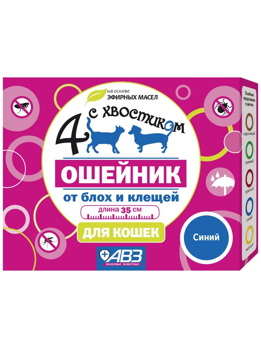 Четыре с хвостиком АВЗ (Агроветзащита) ошейник для кошек, от блох и клещей, синий, 35 см. Преимущества Содержит только натуральные природные действующие вещества. Надежно защищает от большого спектра насекомых и клещей, паразитирующих на кошках. Выбор размеров для животных разных пород. Оказывает длительный репеллентный эффект. Состав и основные свойства В качестве действующих веществ композицию эфирных масел лаванды, цитронеллы, мяты перечной, герани и эвкалипта. Ошейник выпускают в форме свернутой полимерной ленты длиной 35 см в герметично закрытом бумажном пакете, упакованным в картонную пачку. Эфирные масла лаванды, цитронеллы, мяты перечной, герани и эвкалипта обладают репеллентным действием в отношении иксодовых и чесоточных клещей, блох, вшей и власоедов, паразитирующих у кошек. Входящая в состав ошейника композиция эфирных масел постепенно выделяясь с поверхности полимерной ленты не всасывается в системный кровоток, накапливается в сальных железах тела животного, оказывая отпугивающее действие на насекомых и клещей. Ошейник Четыре с хвостиком хорошо переносится кошками разных пород и возрастов. Подходит для больных и ослабленных животных, а также для беременных и кормящих самок. Показания к применению Ошейник репеллентный Четыре с хвостиком применяют кошкам для защиты от блох, вшей, власоедов, комаров, иксодовых и чесоточных клещей. После вскрытия упаковки ошейник надевают на животное, подгоняя по размеру так, чтобы между шеей и ошейником оставался промежуток в 1 см, затем пропускают свободный конец ленты через фиксатор, а излишек ленты отрезают, оставляя конец 1, 5-2 см. Непрерывное ношение ошейника обеспечивает защиту кошек от насекомых до 3-х мес., клещей не менее 4-х недель. При сильной степени поражения животного насекомыми, перед применением ошейника, животное рекомендуется вымыть зоошампунем Луговой, а подстилки обработать спреем БАРС или БАРС форте. Ошейник Четыре с хвостиком не следует применять котятам моложе 2-х месячного возраста. Побочные реакции При повышенной индивидуальной чувствительности животного к компонентам препарата и появлении осложнений (слезотечение, избыточное слюноотделение, мышечная дрожь, рвота) или признаков раздражения кожи использование ошейника следует прекратить. Меры личной профилактики По окончании работы руки необходимо вымыть теплой водой с мылом. Хранение и срок годности Хранят ошейник в закрытой упаковке производителя, в защищенном от света и влаги месте, отдельно от пищевых продуктов и кормов, при температуре до 25 С. Срок годности 2 года со дня производства.