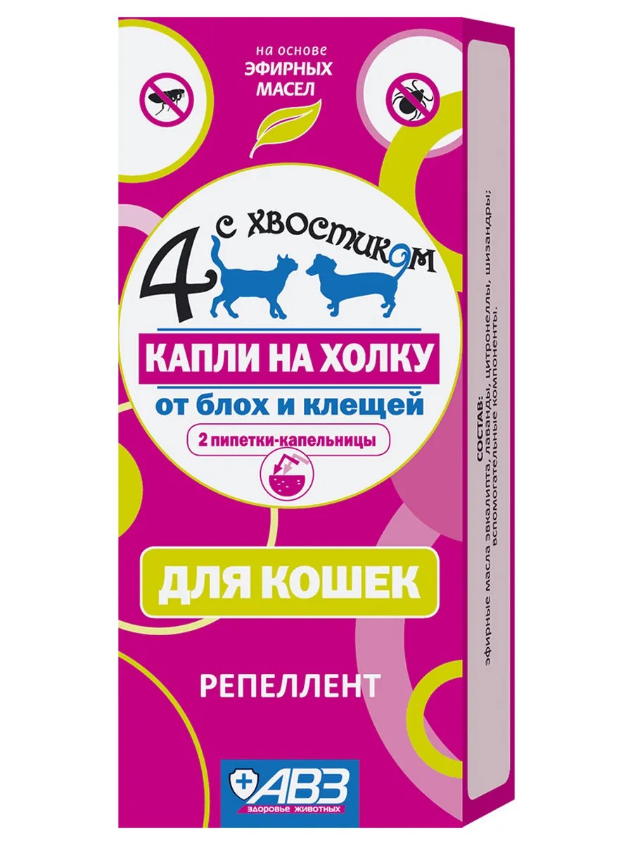 Four with a Tail AVZ (Agrovetzashita) flea and tick drops for cats, 2 pipettes. Benefits: Contains a blend of natural essential oils. Reliably protects animals from attacks by a wide range of insects and ticks that infest cats. Completely safe to use. Ingredients and Properties: Four with a Tail drops contain a blend of lavender (2%), citronella (2%), and schisandra (2%) essential oils. The drops are a clear, light-yellow oily liquid with a distinctive aromatic odor. The essential oils of lavender, citronella, and schisandra, included in the drops, have a pronounced repellent effect on lice, fleas, chewing lice, ixodid, and sarcoptic mites that infest cats. The repellent effect after a single treatment lasts up to 3 weeks against ixodid ticks and up to 8 weeks against fleas. Four-and-a-Tail Repellent Drops applied to the withers, when used at the recommended doses, do not have a local irritant, resorptive-toxic, or sensitizing effect. Indications: For cats, to prevent entomoses, sarcoptic mange, notoedrosis, and ixodid tick infestations. Apply the drops to the skin along the spine, parting the fur, at several points on the back between the shoulder blades, on the head, and at the base of the tail, at the doses indicated in the table. Repeat treatments are performed as indicated. Special Instructions: If the drops accidentally come into contact with mucous membranes, rinse immediately with running water. Side Effects: Increased individual sensitivity to the essential oils contained in the drops may cause allergic reactions. In this case, discontinue use of the drug and administer desensitizing therapy. Do not treat nursing animals or kittens under 8 weeks of age. Storage and shelf life: Store the drug in the manufacturer's packaging, protected from light and moisture, at a temperature of 0 to 30°C. Shelf life: 2 years from the date of manufacture. Dosage form: Polymer dropper. Outer packaging: Cardboard box containing 2 droppers.
