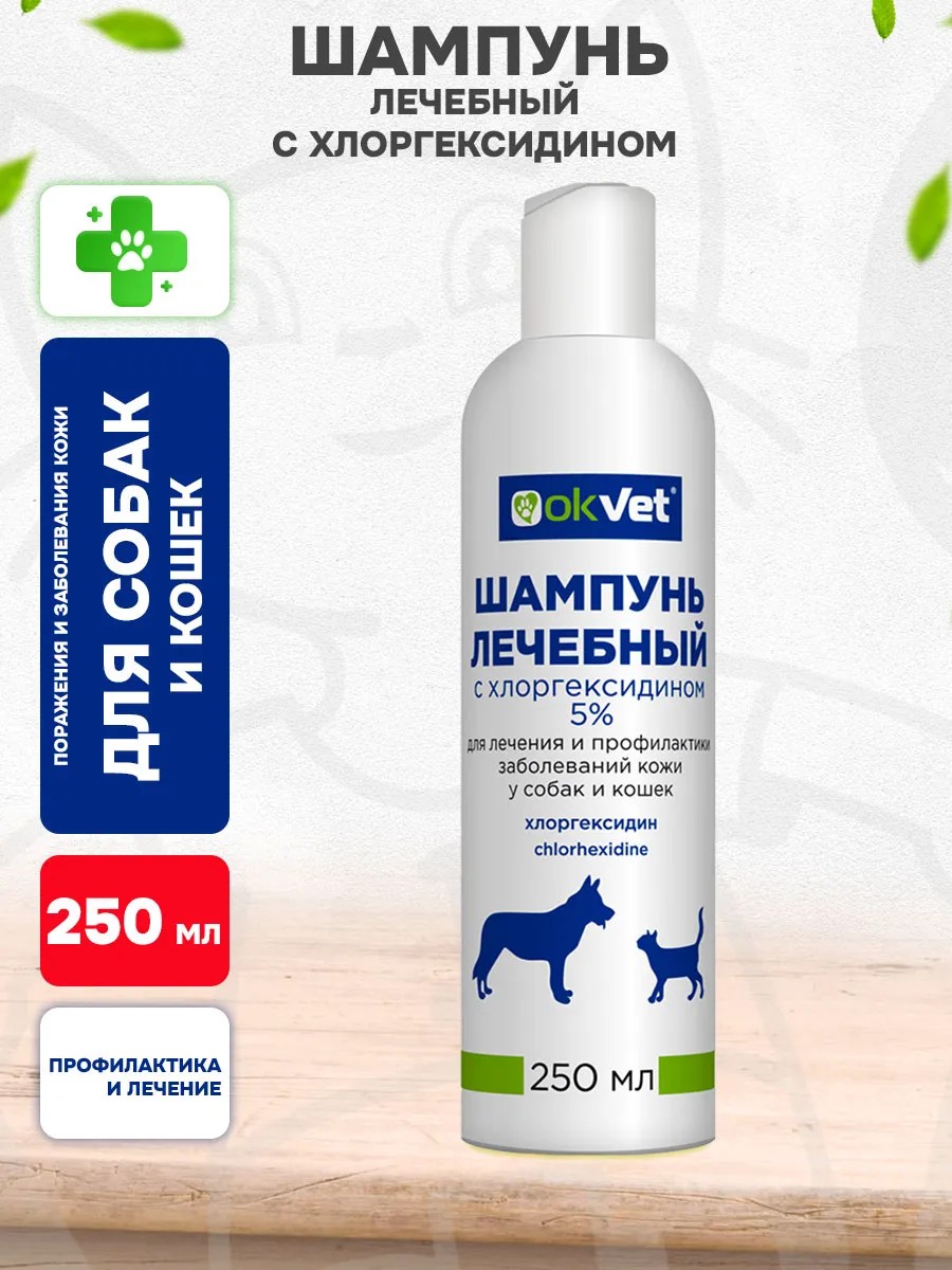 "Okvet Therapeutic Shampoo with Chlorhexidine" is prescribed as a therapeutic, prophylactic and antiseptic agent for dogs and cats with superficial and deep pyoderma, dermatophytosis and malasseziosis, as well as mixed lesions of the skin and hair in dogs and cats, seborrhea, dermatitis, minor wounds, abrasions, scratches and other skin lesions complicated by bacterial infection, in combination with symptomatic and pathogenetic agents; as a means of preventing complications after haircuts, shaving, and trimming.