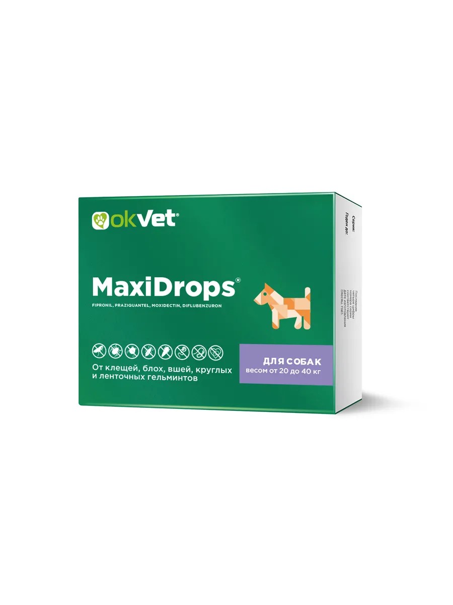MaxiDrops is prescribed to adult dogs and puppies for the treatment and prevention of associated parasitic diseases caused by fleas, ixodid ticks, lice, scabies and trombidiform mites, nematodes and cestodes, for the prevention of dirofilariasis caused by the larvae of Dirofilaria immitis and Dirofilaria repens, as well as to reduce the risk of infection with babesiosis and borreliosis, which are carried by ixodid ticks.