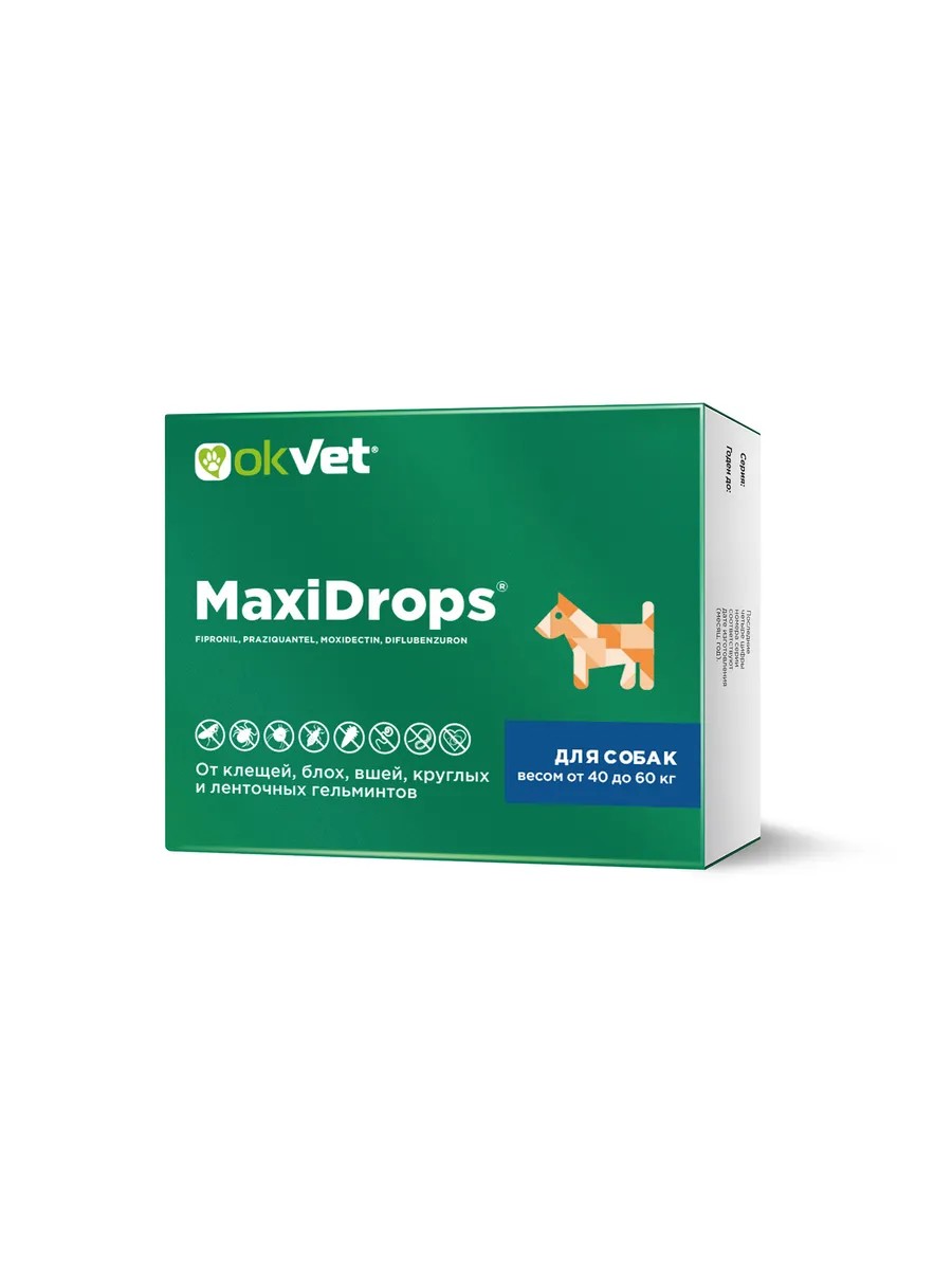 MaxiDrops is prescribed to adult dogs and puppies for the treatment and prevention of associated parasitic diseases caused by fleas, ixodid ticks, lice, scabies and trombidiform mites, nematodes and cestodes, for the prevention of dirofilariasis caused by the larvae of Dirofilaria immitis and Dirofilaria repens, as well as to reduce the risk of infection with babesiosis and borreliosis, which are carried by ixodid ticks.