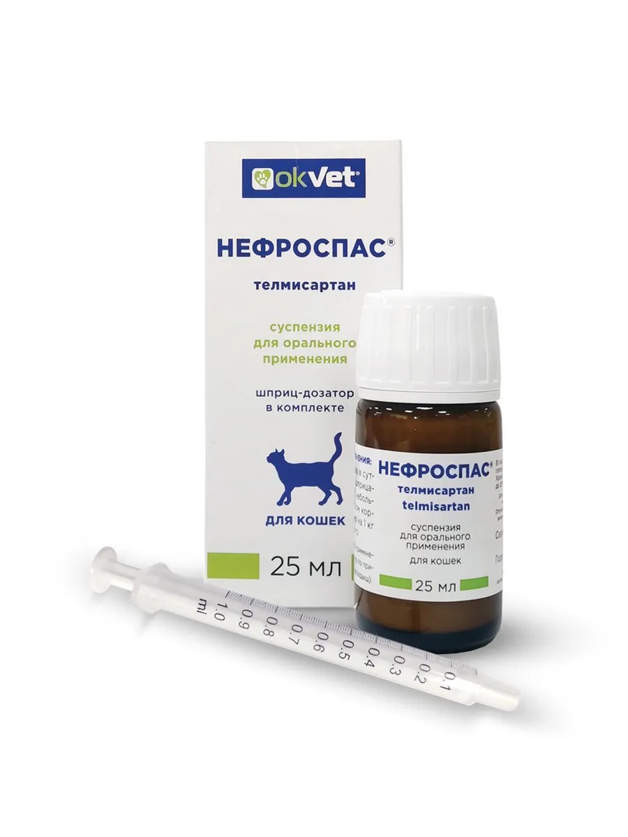 NEFROSPAS is prescribed to reduce the level of nephrotoxic proteinuria in chronic kidney disease (CKD) and the treatment of concomitant systemic hypertension and CKD in cats. Advantages: DESIGNED SPECIFICALLY FOR CATS IMPROVES QUALITY OF LIFE in cats with chronic kidney disease (CKD) COMFORTABLE TO USE thanks to the included dosing syringe CONVENIENT DOSAGE SCHEME - once a day ECONOMICAL CONSUMPTION - the bottle volume lasts a long time SUITABLE FOR LIFELONG USE - the duration of the treatment course is unlimited Composition and pharmacological properties: 1 ml of NEFROSPAS contains telmisartan as the active ingredient - 10 mg and excipients: propylene glycol, maltitol, benzalkonium chloride, purified water. Telmisartan, a component of this medication, is a specific antagonist of the angiotensin II AT1 receptor, which causes a dose-dependent reduction in arterial blood pressure in mammals, including cats with chronic kidney disease, and a gradual reduction in proteinuria. Telmisartan displaces angiotensin II from its binding to the AT1 receptor, selectively binding to the AT1 receptor without binding to other AT receptors. Stimulation of the AT1 receptor is responsible for the pathological effects of angiotensin II in the kidneys and other organs associated with angiotensin II, such as vasoconstriction (narrowing of blood vessels), sodium and water retention, increased aldosterone synthesis, and proteinuria. However, effects associated with AT2 receptor stimulation, such as vasodilation, natriuresis, and inhibition of inappropriate cell growth, are not suppressed. Receptor binding is maintained for a long time due to the slow dissociation of telmisartan from its binding to the AT1 receptor. Telmisartan does not exhibit AT1 receptor agonist activity and does not affect potassium excretion in chronic kidney disease. Following oral administration to cats, telmisartan is rapidly absorbed into the systemic circulation, reaching peak concentrations of approximately 62.6 ng/ml 1.5-2 hours after administration at a therapeutic dose of 1 mg/kg. Telmisartan is detectable in plasma for 12-32 hours, with a half-life of approximately 7.7 hours. Absolute bioavailability after oral administration is approximately 33%, plasma protein binding (primarily to albumin and ɑ-1-acid glycoprotein) is greater than 99%. Being a lipophilic compound, telmisartan penetrates well into organs and tissues. With long-term administration (for 21 days), clinically significant accumulation of telmisartan in organs and tissues is not observed. Telmisartan is metabolized in the liver to form a pharmacologically inactive glucuronide and is eliminated from the body primarily in feces. NEFROSPAS is administered to cats orally once daily, either by forced administration using a dosing syringe or with a small amount of food, at a dose of 0.1 ml/kg of animal body weight (equivalent to 1 mg telmisartan per 1 kg of animal body weight). The dosage and duration of treatment are determined by the attending veterinarian, depending on the physical condition of the animal and the progression of the disease. The course of treatment has no limit. If one or more doses of NEFROSPAS are missed, administer the therapeutic dose as soon as possible. Do not administer a double dose to make up for the missed dose. After withdrawing the medication, close the vial tightly, rinse the dosing syringe with water, and allow it to dry. To avoid possible contamination, use the dosing syringe only for administering NEFROSPAS. Contraindications: Contraindications to the use of NEFROSPAS include hypersensitivity to any of the components of the drug, including a history of hypersensitivity, cholestasis, biliary obstruction, and severe liver failure. The drug should be administered with caution in patients with chronic heart failure, liver failure, bilateral renal artery stenosis, hypovolemia, hyponatremia, and hyperkalemia, with periodic monitoring of the clinical condition and blood counts (including serum potassium, sodium, and creatinine levels). NEFROSPAS should not be used in pregnant or nursing cats, or in kittens under 6 months of age. This medication is not intended for use in productive animals.