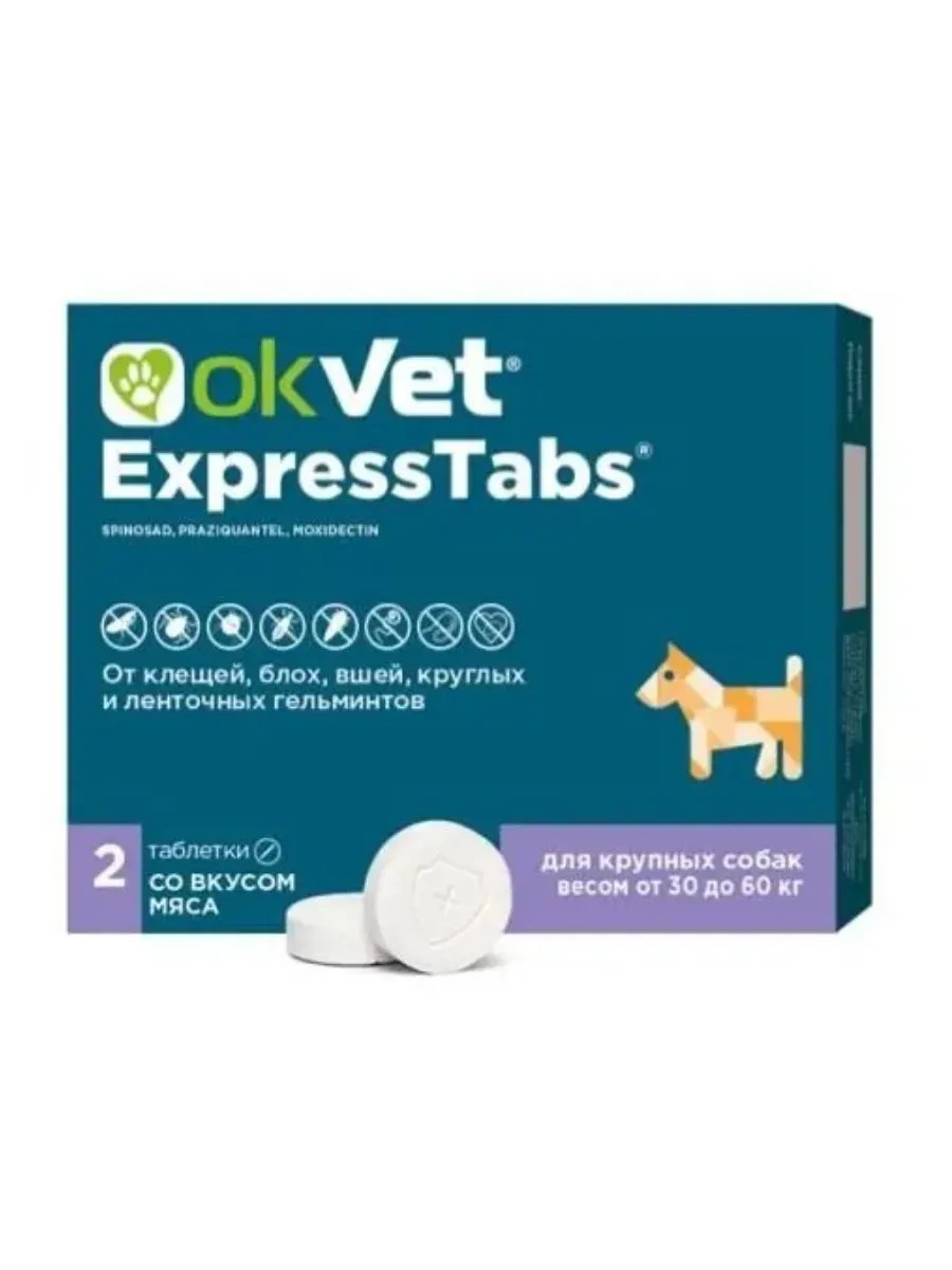 | Full Product Name | OKVET Okvet ExpressTabs tablets against ticks, fleas, lice and helminths for dogs from 30 kg to 60 kg (2 tablets) |