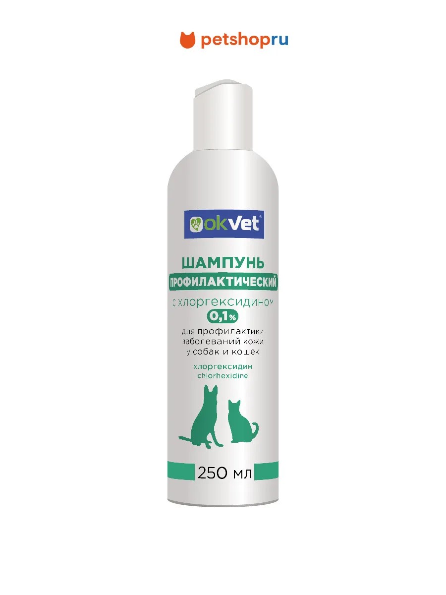 OKVET preventive shampoo with chlorhexidine is prescribed for dogs and cats as an antiseptic for the treatment of minor wounds, abrasions, cuts and other skin diseases complicated by bacterial infection, in combination with symptomatic and pathogenetic