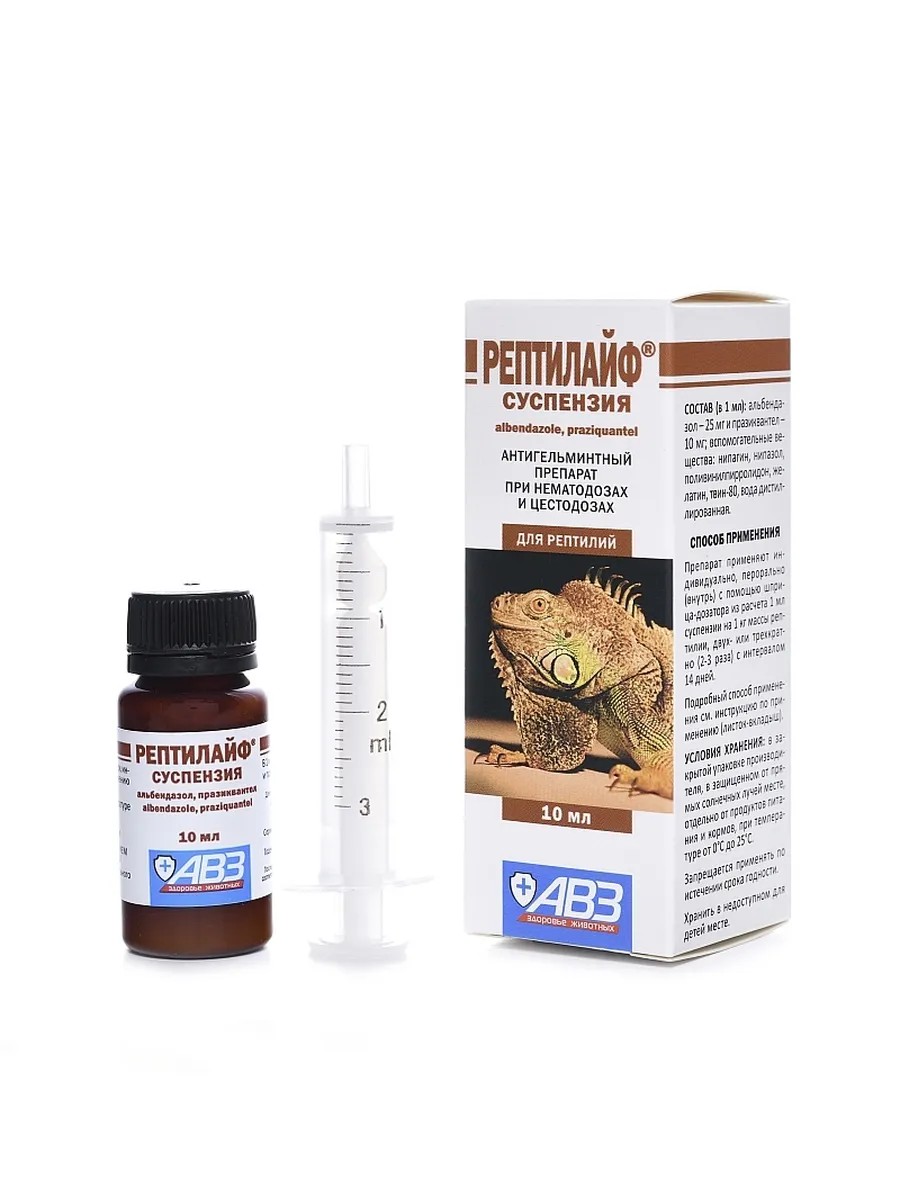 Reptilife suspension contains albendazole - 25 mg and praziquantel - 10 mg as active ingredients per 1 ml, as well as excipients.