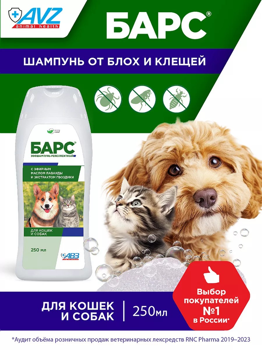 Шампунь применяют для защиты собак и кошек от блох, вшей, власоедов, комаров, иксодовых и чесоточных клещей. Оберегайте своих четвероногих друзей от нежелательных гостей с шампунем БАРС – вашим мощным союзником в борьбе против блох, клещей и других паразитов! Не только защита, но и уход: шампунь Барс увлажняет и смягчает кожу вашего питомца, снимает зуд и раздражение, придавая шерсти естественный блеск и предотвращая ее выпадение и ломкость. Входящие в состав зоошампуня экстракт гвоздики и эфирное масло лаванды оказывают репеллентное действие. Глицерин и аллантоин обладают увлажняющими, смягчающими и противовоспалительными свойствами, оказывают регулирующее действие на естественный гидробаланс кожи, устраняют сухость и шелушение. Активизируя обменные процессы в волосяных луковицах, способствуют восстановлению защитных функций эпидермиса, улучшают структуру волос, облегчают расчесывание и предотвращают спутывание шерсти, устраняют перхоть. Благодаря своей формуле, шампунь подходит для животных любого возраста и является идеальным выбором для регулярного использования. Перед нанесением зоошампуня наружный слуховой проход животному закрывают для предотвращения попадания воды и кожно-волосяной покров животного обильно смачивают теплой водой, затем наносят зоошампунь, равномерно распределяя по поверхности тела и слегка втирая до образования пены. Через 2-3 минуты зоошампунь смывают теплой водой, шерсть высушивают и, у длинношерстных пород животных, расчесывают. Противопоказание: повышенная индивидуальная чувствительность к компонентам препарата. Перед применением рекомендуется тест на чувствительность. Ваш питомец заслуживает лучшего ухода и защиты. Выберите шампунь Барс – и пусть ваш четвероногий друг всегда остается здоровым, счастливым и блестящим!