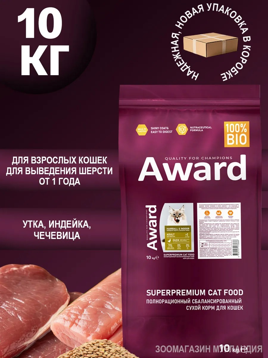 Сухой корм AWARD Hairball & Indoor для взрослых кошек для выведения шерсти с уткой и индейкой с добавлением зеленой чечевицы и Юкки Шидигера 10 кг.